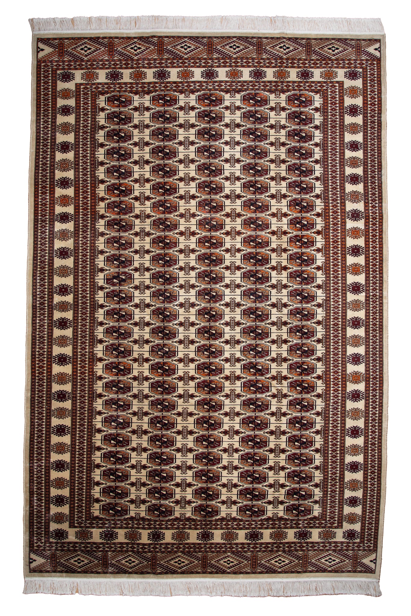This antique Indian wool rug is a rare low-pile gem echoing the spirit of classical Bokhara weaves. Hand-knotted with precision, it features rows of iconic Tekke gul motifs in rich russet, deep aubergine, and burnt orange, all set against a warm ivory field. The low pile enhances its age-softened charm and finely aged patina, evoking a refined, tactile elegance. Framed with multiple borders bearing intricate rosettes and geometric flourishes, this rug reflects a deep lineage of nomadic artistry reinterpreted through Indian craftsmanship. Ideal for collectors and aesthetes, it brings warmth, history, and understated luxury into any curated living space.