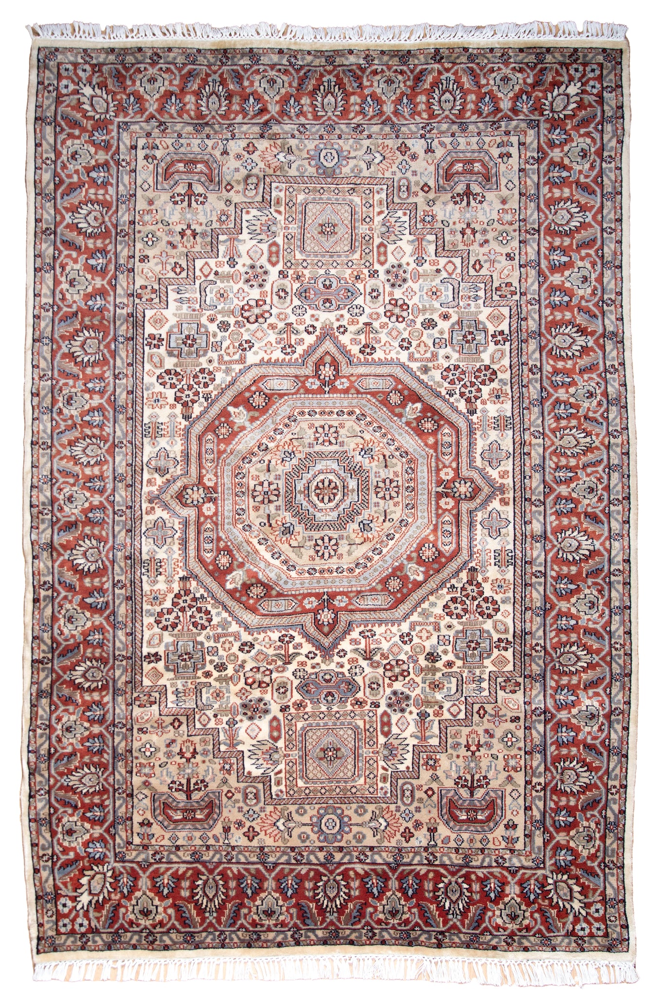 A striking blend of symmetry and soul, this handwoven Indian wool rug features a rare octagonal medallion set against a luminous ivory field—echoing the architectural harmony of traditional stepwells and mandalas. Crafted from richly dyed wool, the palette of terracotta, slate, and soft blues is both grounded and refined. Intricate tribal and geometric motifs fill the field and corners with narrative precision, while the robust floral border adds movement and depth. The rug's crisp detailing and fine knotting reflect expert craftsmanship. A perfect fusion of heritage and design, this piece elevates interiors with timeless artistry and cultural resonance.