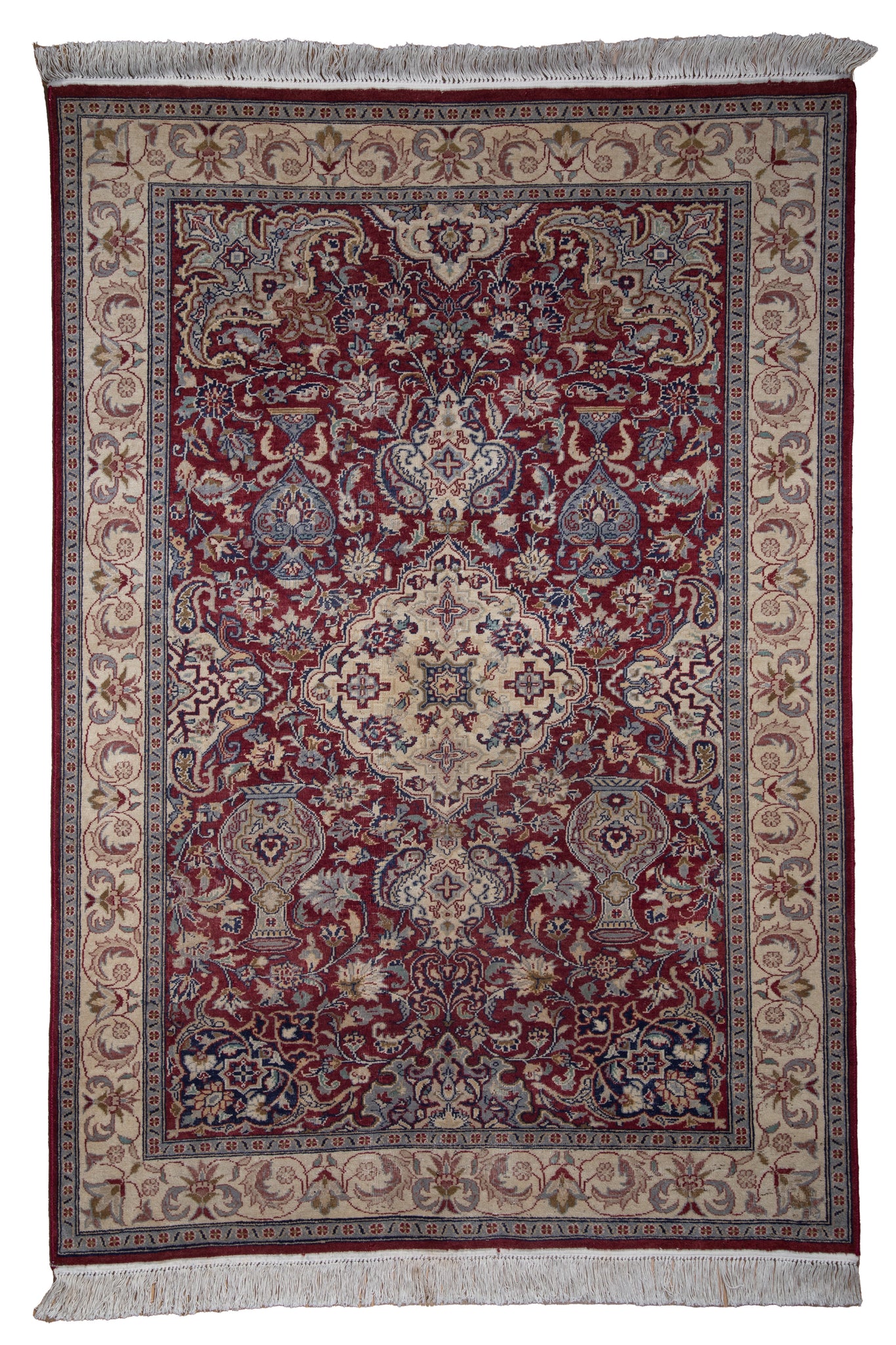 This exquisite Kashmiri wool rug is a masterclass in elegance and heritage, featuring a grand medallion anchored in an opulent field of imperial red. Handwoven using premium Himalayan wool, its dense, velvety pile showcases a mesmerizing interplay of floral vases, arabesques, and scrolling vines in ivory, indigo, and sapphire hues. Inspired by classical Persian aesthetics, this rug embodies centuries of craftsmanship from the Kashmir valley. The intricately detailed borders frame the composition with grace and sophistication. Ideal for luxurious interiors, this timeless piece transforms any room into a sanctuary of artful serenity, appealing to collectors and lovers of handmade, storied design.