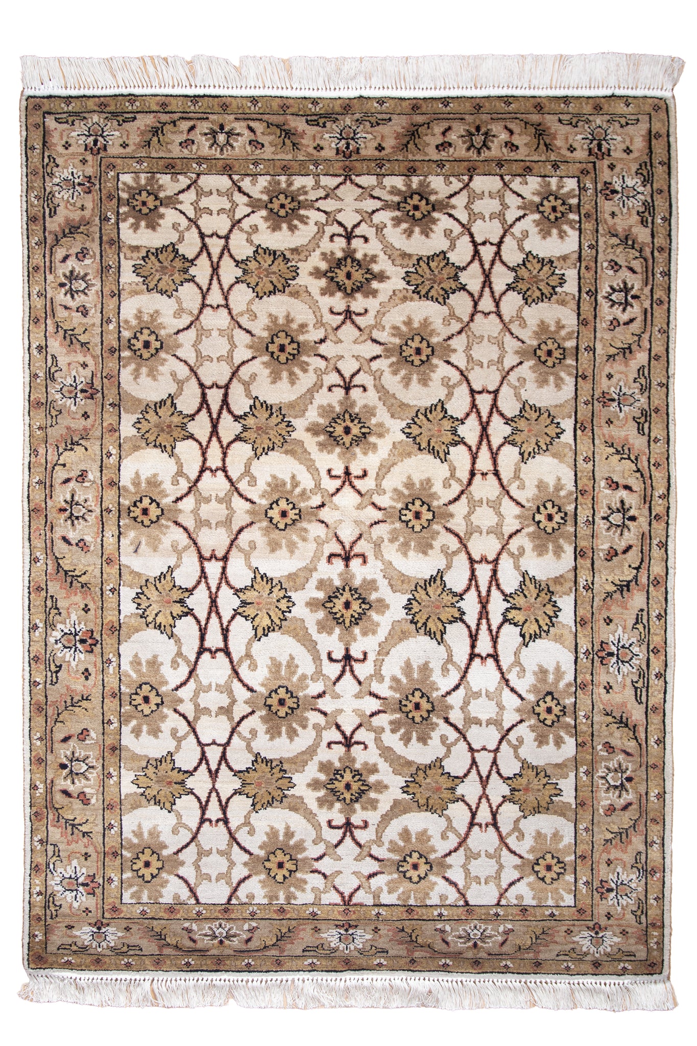 This vintage Agra wool rug exemplifies timeless elegance with its refined vine latticework and floral medallions, all hand-knotted in earthy tones of ivory, beige, and muted gold. The pattern, inspired by Mughal palace gardens, unfolds in graceful symmetry—each motif a testament to meticulous Indian craftsmanship. Woven from premium wool, the rug boasts a luxuriously soft texture and enduring durability. Its subtle sheen and understated palette lend it versatility, seamlessly complementing both classic and contemporary interiors. A symbol of heritage and artistry, this Agra rug is more than décor—it's a woven legacy that brings warmth, grace, and history into your space.