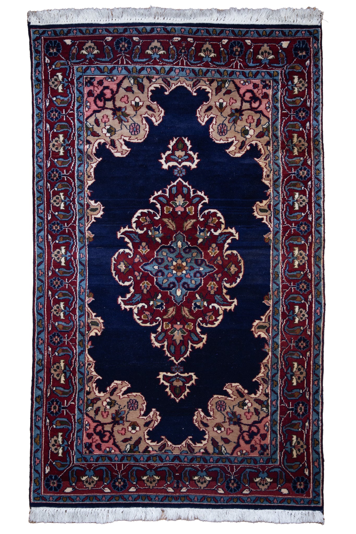 This elegant wool Kashmiri rug captures the timeless allure of classical Persian design with a bold Kashmiri touch. A deep navy-blue field forms the backdrop for a radiant central medallion in ruby red, sky blue, and ivory, symbolizing balance and refinement. The rich red spandrels with floral motifs and the intricate border detailing add warmth and definition to the composition. Hand-knotted using high-quality Kashmiri wool, the rug offers exceptional softness, durability, and a gentle sheen. Perfect for traditional or transitional interiors, this piece weaves heritage and luxury into one harmonious creation—ideal for collectors and those with a taste for timeless art.