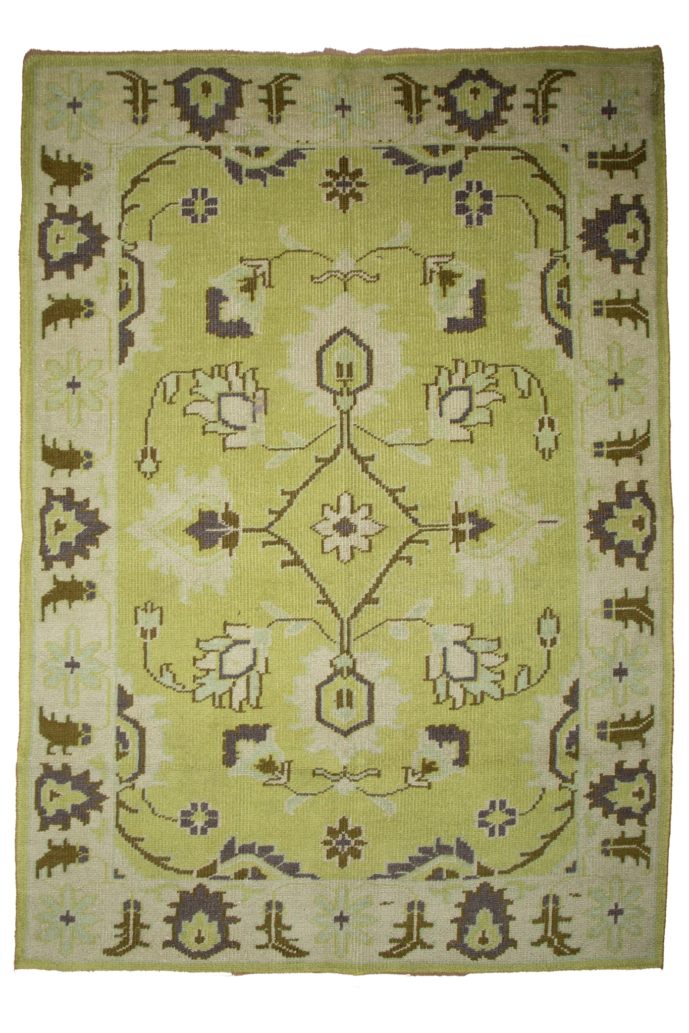 Infused with vibrant charm, this Indo Kashan wool rug reimagines a timeless Persian floral medallion layout in an unexpected and refreshing olive green palette. Hand-knotted with premium wool by master artisans, its stylized lotus blossoms, palmettes, and vine scrolls are artfully arranged in soft ivory, charcoal, and celadon hues. The harmonious composition balances tradition with a playful modern twist, making it a bold statement for eclectic or contemporary interiors. The lush wool pile provides warmth and comfort, while the unique coloration ensures this rug stands out as a conversation piece. A radiant fusion of heritage craftsmanship and progressive design sensibility.