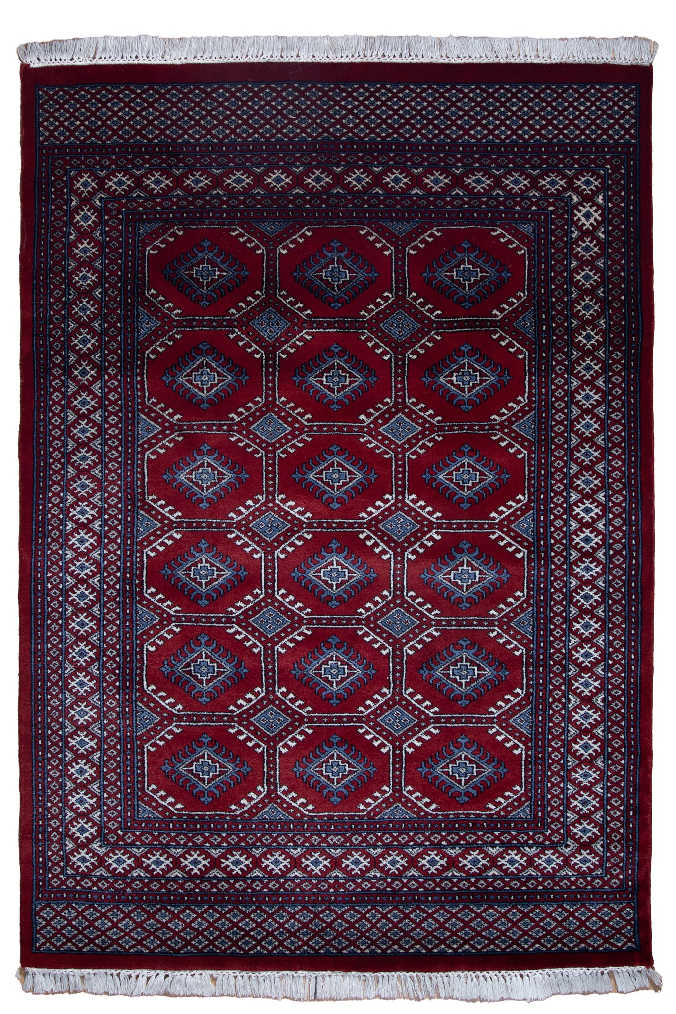 This striking Indo Afghan wool rug is a bold homage to traditional Turkmen aesthetics, showcasing the iconic “Gul” octagonal motifs meticulously hand-knotted across a deep crimson field. Each geometric medallion is rendered in shades of midnight blue, ivory, and cobalt, echoing tribal symbolism and nomadic artistry. The dense wool pile offers both durability and warmth, making it ideal for high-traffic spaces. Framed by intricate multi-tiered borders filled with rhythmic tribal patterns, this rug speaks to heritage, balance, and craft. A timeless statement piece, it brings a sense of rooted elegance to collectors’ interiors and curated contemporary homes alike.