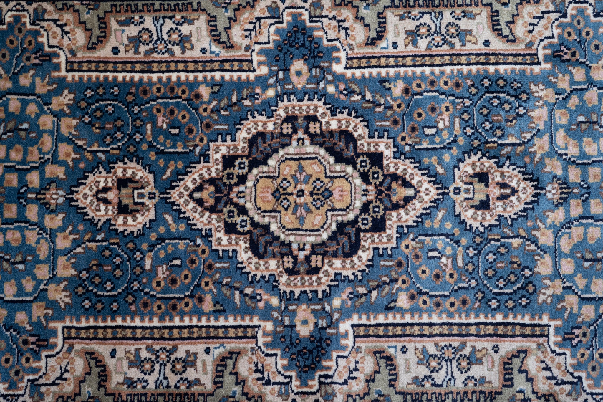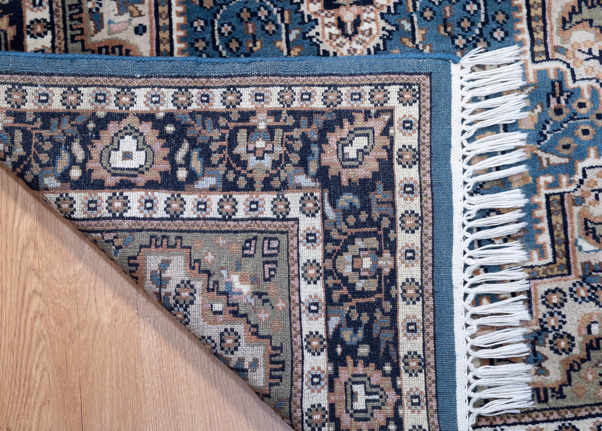 Exuding grandeur and symmetry, this hand-knotted Indian wool rug features a majestic central medallion flanked by intricate palmettes and floral scrolls—echoing the refined geometry of traditional Persian Sarouk carpets. The cool-toned palette of midnight blue, slate, ivory, and soft gold is masterfully balanced, giving the rug both richness and serenity. Crafted from premium hand-spun wool, it offers a velvety pile and enduring quality. The lavish floral border frames the field with rhythmic elegance, making it a timeless statement for luxury interiors. A collector’s delight, this rug celebrates heritage craftsmanship and sophisticated artistry woven into every thread.
