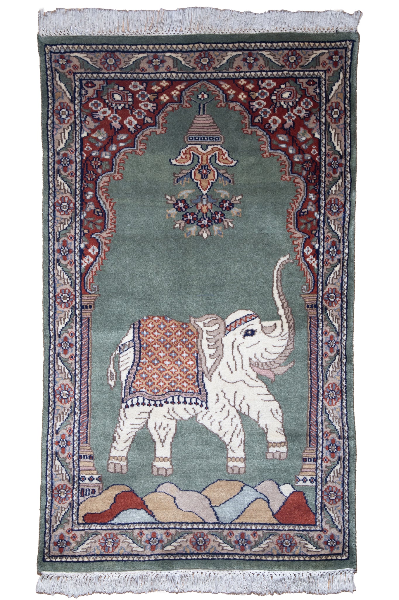 A majestic celebration of India's royal heritage, this hand-knotted wool rug features a splendid ivory elephant adorned in a richly patterned saddlecloth, set against a serene sage green backdrop. The intricate archway design above mirrors Mughal architectural elements, while floral borders in deep crimson and indigo frame the composition with regal elegance. Crafted from premium wool, the pile offers both softness and durability, ideal for collectors who value tradition and fine artistry. Each detail reflects the artisan’s devotion to cultural storytelling—evoking the grandeur of royal processions and temple murals through vibrant hues and timeless Indian craftsmanship.