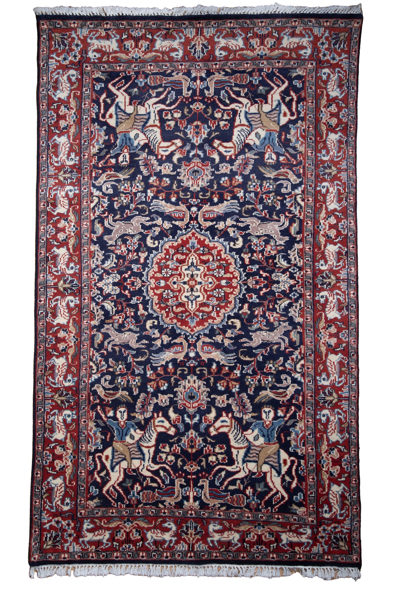 Steeped in narrative elegance, this Indo Kashan wool rug captures the grandeur of royal hunting scenes through masterful hand-knotting and rich, time-honored design. The deep navy field hosts galloping horsemen, leaping deer, and mythic beasts—each meticulously woven in earthy ivory, scarlet, and ochre tones. A bold central medallion anchors the composition, while a crimson border teems with stylized flora and fauna, echoing Persian storytelling traditions. Woven from lustrous, high-quality wool, this piece combines visual drama with plush durability. Perfect for collectors of heritage rugs, it transforms any space into a tableau of classical artistry and historical depth.