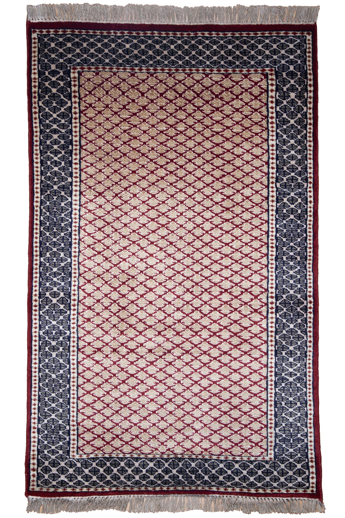 A study in refined symmetry, this hand-knotted Indian wool rug features a regal trellis pattern, delicately woven in a rich ruby red and ivory palette. The central field glows with small-scale, floral-inspired latticework—each motif perfectly aligned to create a rhythmic and luxurious texture. The midnight blue border, adorned with geometric florals in soft cream, adds bold contrast and visual depth. Made from premium hand-spun wool, this rug offers lasting softness and durability. Minimal yet intricate, its design bridges traditional elegance and contemporary style, making it a perfect choice for collectors and designers seeking timeless beauty in handcrafted form.