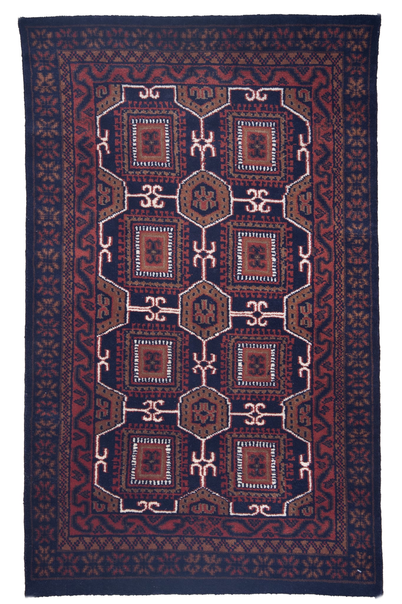 Boldly tribal yet elegantly structured, this hand-knotted Indian wool rug draws inspiration from Central Asian design traditions. Its deep indigo field is punctuated by a striking grid of ochre, crimson, and ivory medallions, each echoing ancestral motifs rooted in nomadic heritage. Crafted from pure hand-spun wool, the rug offers a luxuriously soft pile with remarkable durability. Intricate borders in rust and garnet hues anchor the composition, creating a sense of rhythm and balance. A testament to generational craftsmanship, this piece speaks to collectors who seek timeless design, symbolic geometry, and authentic handwoven artistry steeped in tradition and cultural resonance.