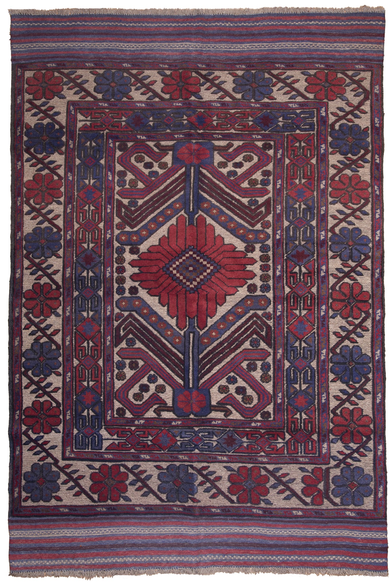 This vibrant Barjesta kilim from Afghanistan showcases the unique blend of flatweave and pile techniques that define this traditional style. Handwoven from fine wool, it features a bold red medallion framed by stylized floral bursts and intricate tribal detailing in navy, ivory, and maroon. The raised motifs offer a rich textural contrast against the kilim base, while the striped ends and floral borders anchor the design in classic nomadic symbolism. Radiating warmth, heritage, and craftsmanship, this kilim is perfect for collectors and connoisseurs seeking authenticity and character. A true statement piece steeped in Afghan tribal artistry and cultural resonance.