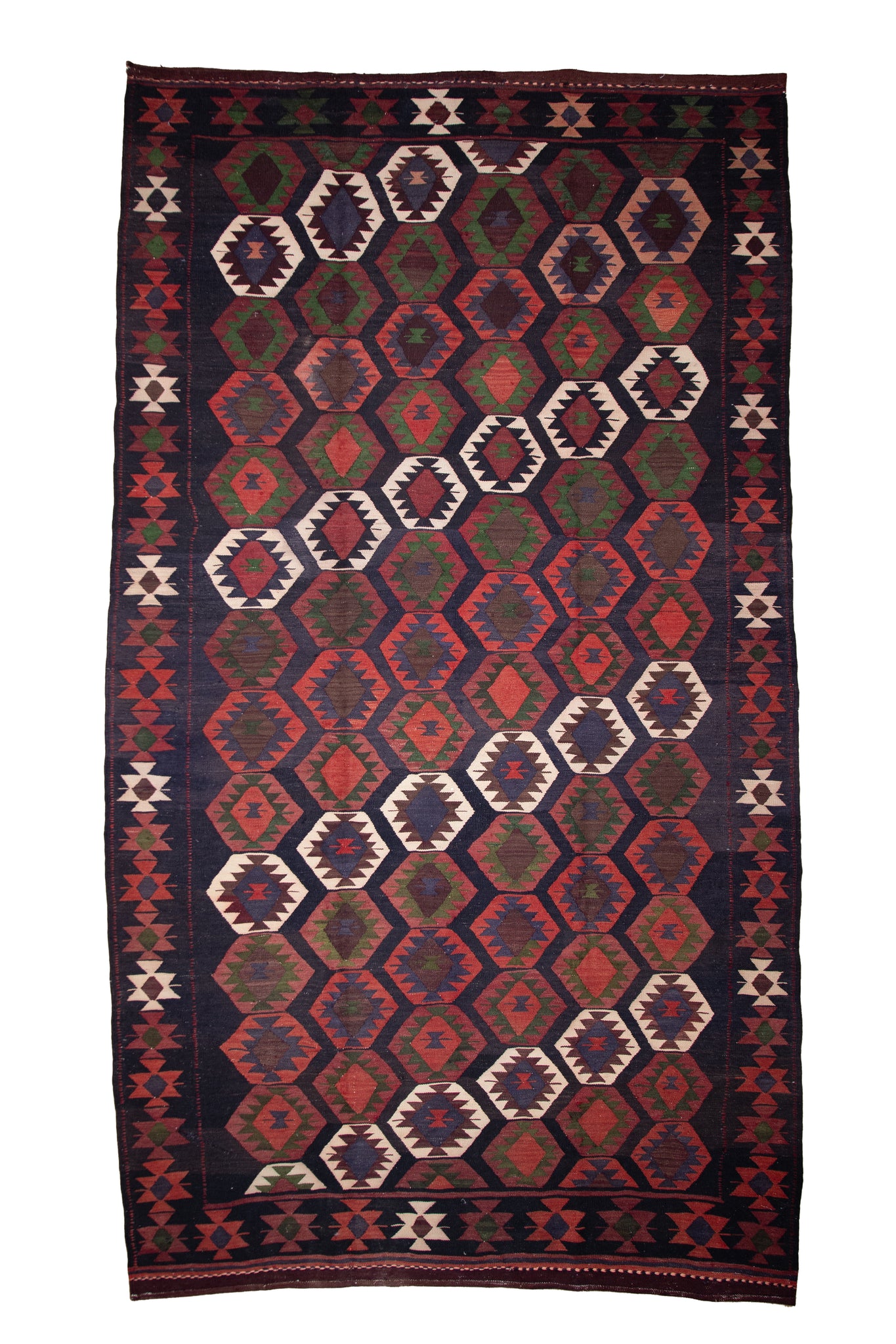 This antique Caucasian kilim is a vivid expression of tribal geometry, handwoven with rhythmic mastery and cultural symbolism. A field of serrated hexagons—each nested with diamond medallions—unfolds in deep indigo, crimson, forest green, ivory, and earthen brown, reflecting the organic palette of the Caucasus mountains. The meticulous flatweave structure showcases traditional wool dyed with vegetal pigments, offering a tactile, heirloom-quality texture. Symbolizing protection and unity, the motifs carry a timeless narrative rooted in nomadic heritage. Bold yet balanced, this kilim is a rare collector’s piece that brings energy, authenticity, and artistic spirit to refined interiors and curated textile collections.