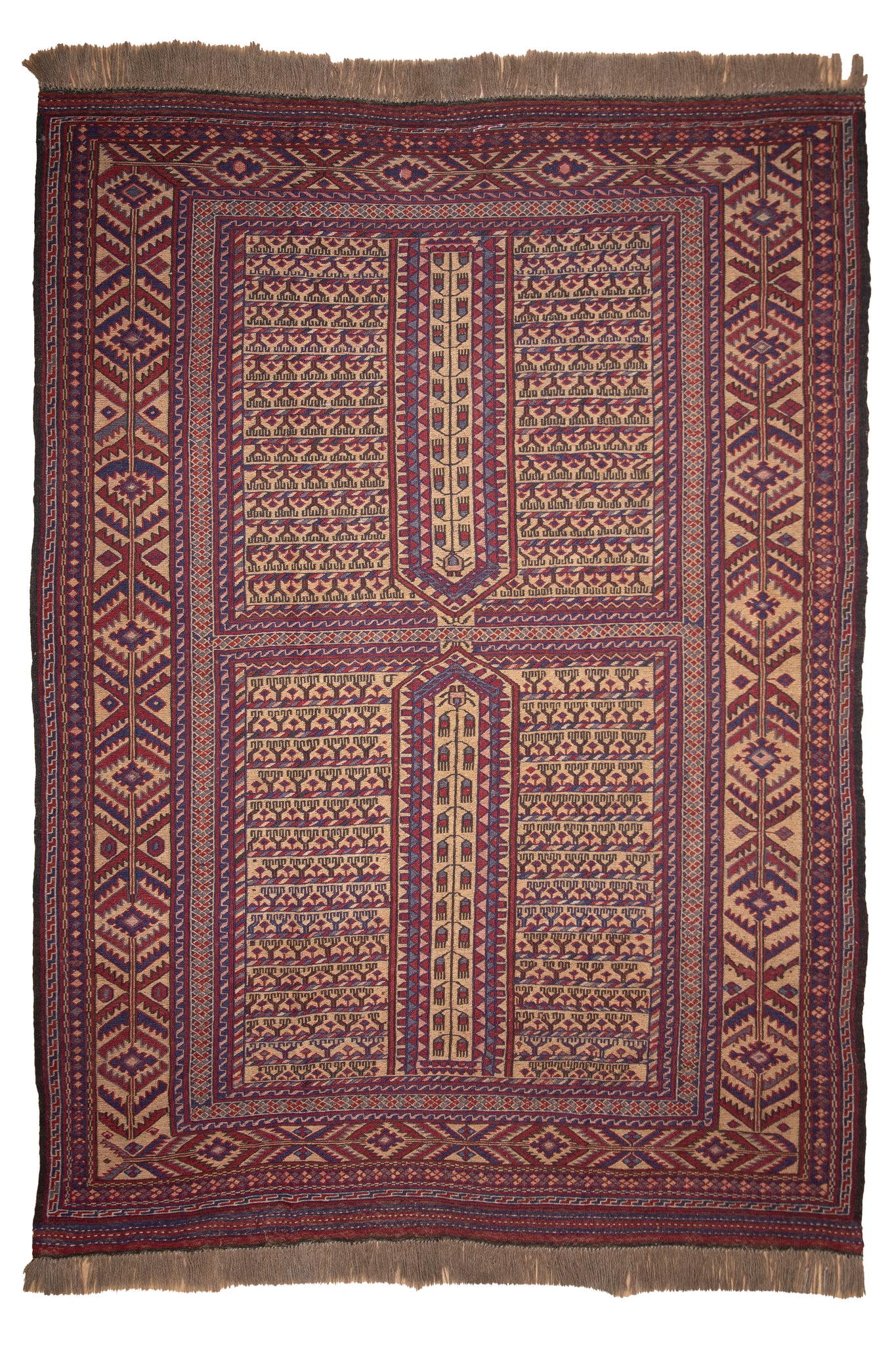 This antique Ersari kilim is a rare cultural relic, handwoven by Turkmen weavers with a mastery passed through generations. The layout—reminiscent of sacred tent doors—is adorned with totemic motifs in deep madder red, indigo, and ivory, set against a sand-toned wool base. Crafted using the traditional slit weave technique, the kilim showcases intricate precision and balanced symmetry, each symbol echoing pastoral life and tribal identity. The vegetal dyes lend a beautifully aged patina, enhancing its collector appeal. Ideal for connoisseurs of nomadic textiles, this piece embodies the soul of Central Asian heritage in both its form and story.