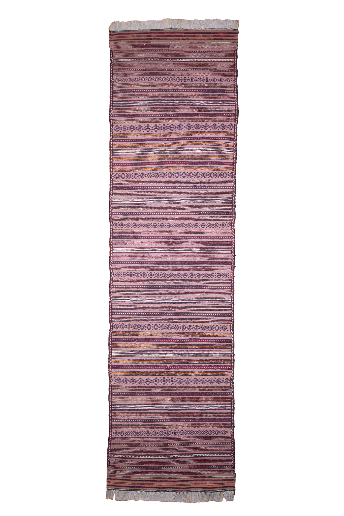 This antique Maliki Soumak kilim from Herat, Afghanistan, is a rare testament to the region’s storied weaving tradition. Handwoven using the Soumak technique, it features finely wrapped wefts that create a rich, textured surface, both durable and visually captivating. The soft rose, plum, and rust tones blend in rhythmic horizontal bands, each motif reflecting tribal identity and symbolism. Woven from handspun wool and naturally dyed, the kilim carries the essence of Herati nomadic culture—refined yet rooted. Ideal for collectors of antique textiles, this piece embodies authenticity, subtle luxury, and the enduring legacy of Afghanistan’s artisan heritage.
