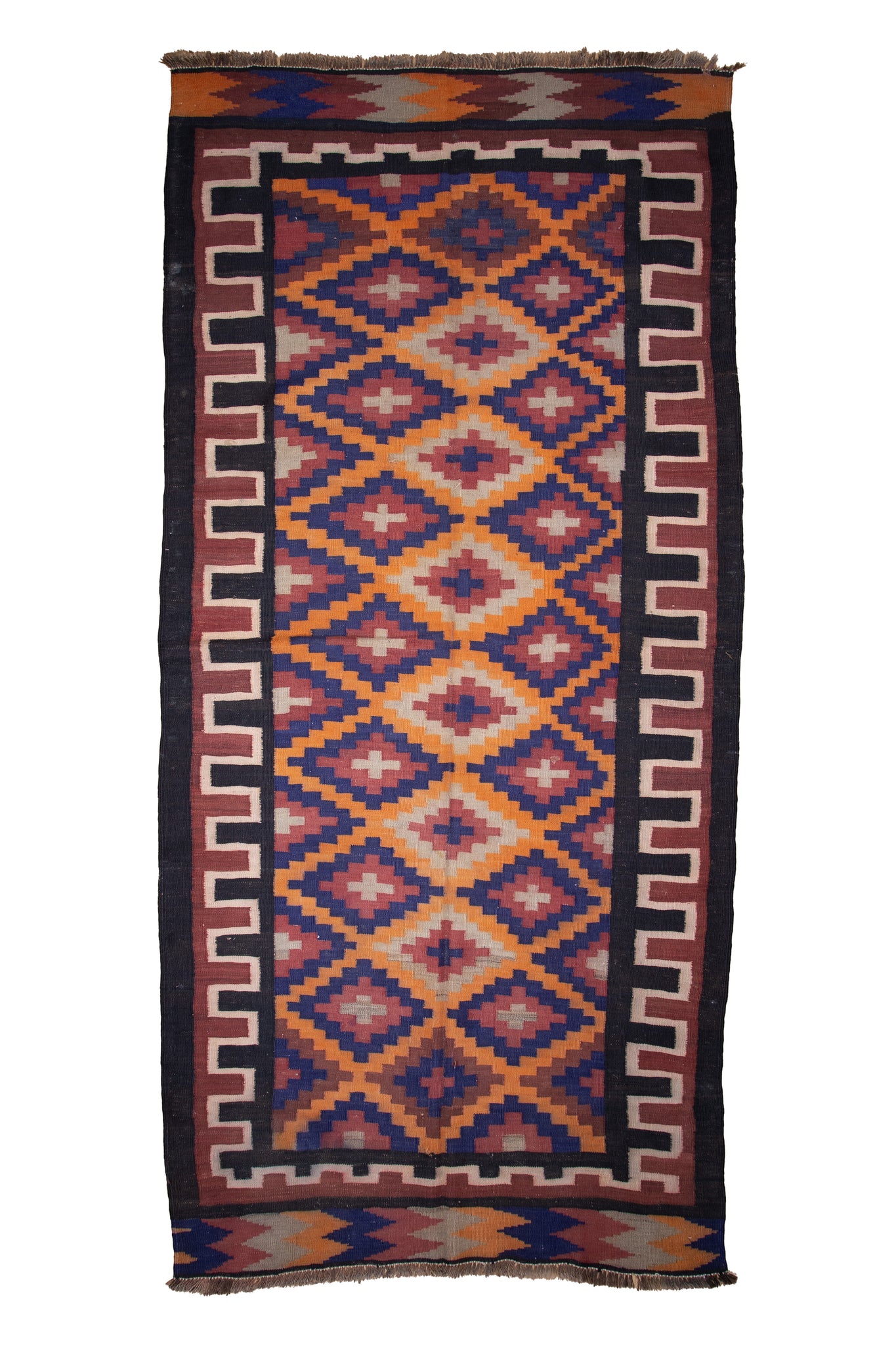This antique Persian kilim is a bold and rhythmic expression of tribal artistry, featuring a fiery palette of saffron orange, indigo, crimson, and ivory. Handwoven with exceptional precision, its stacked diamond lattice design radiates movement and symmetry, evoking the flicker of flame and the pulse of nomadic life. The stepped borders, framed in geometric precision, provide a striking contrast that anchors the vibrant center. Woven entirely from handspun wool and dyed with natural pigments, this flatweave rug is as durable as it is evocative. A dynamic collector’s piece, it bridges ancient craftsmanship with enduring visual drama and cultural soul.