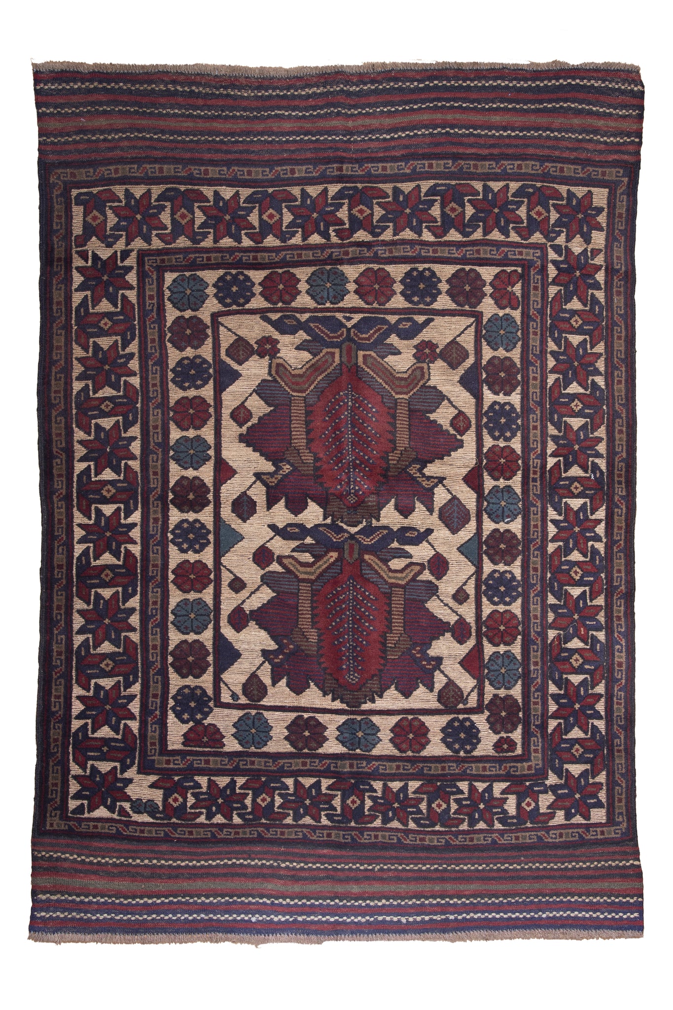A rare expression of botanical artistry, this antique Persian kilim showcases twin stylized leaf motifs—symbols of growth, renewal, and tribal harmony. Handwoven in earthy tones of burgundy, navy, ivory, and walnut, the composition is framed by floral borders rich with eight-petaled rosettes. The design radiates symmetry, serenity, and a deep respect for nature, all hallmarks of southern Persian weaving traditions. Crafted in hand-spun wool and dyed with natural pigments, this kilim’s flatweave texture is both tactile and timeless. Ideal for display or light use, it appeals to collectors seeking tribal symbolism with decorative elegance and heritage.