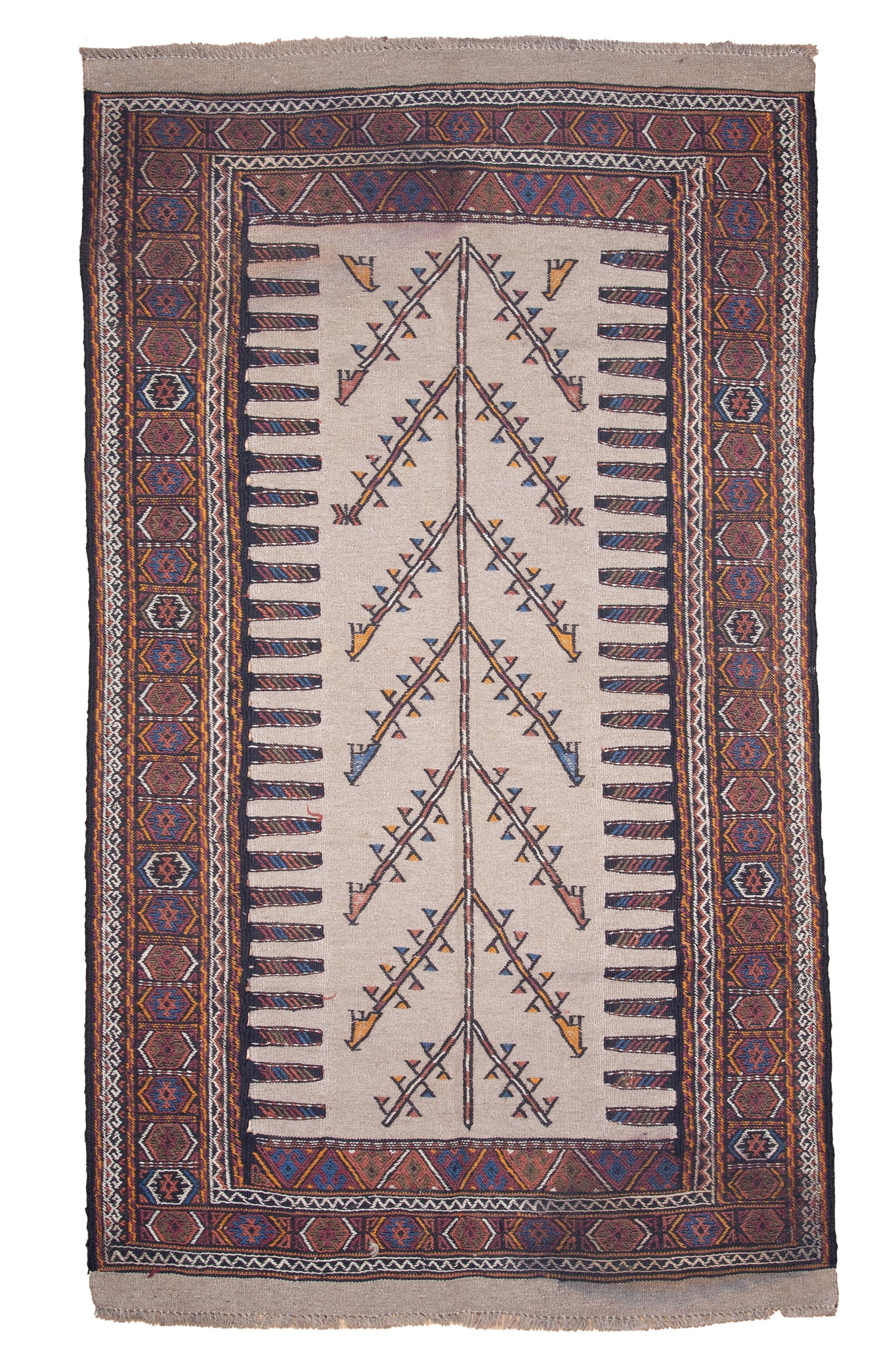This antique Shirazi kilim is a poetic reflection of tribal symbolism and masterful handweaving. Woven with fine handspun wool and natural dyes, the rug features a minimal yet striking Tree of Life design, flanked by symmetrical arrows and branches in rich saffron, indigo, and brick tones on a warm ivory field. Intricate borders in repeating hexagonal motifs frame the composition with rhythmic precision, showcasing the ancestral artistry of Shiraz. Light yet durable, this flatweave exudes elegance and heritage. A rare collectible, it effortlessly bridges traditional Persian aesthetics with contemporary appeal—ideal for refined interiors and discerning collectors of tribal textiles.