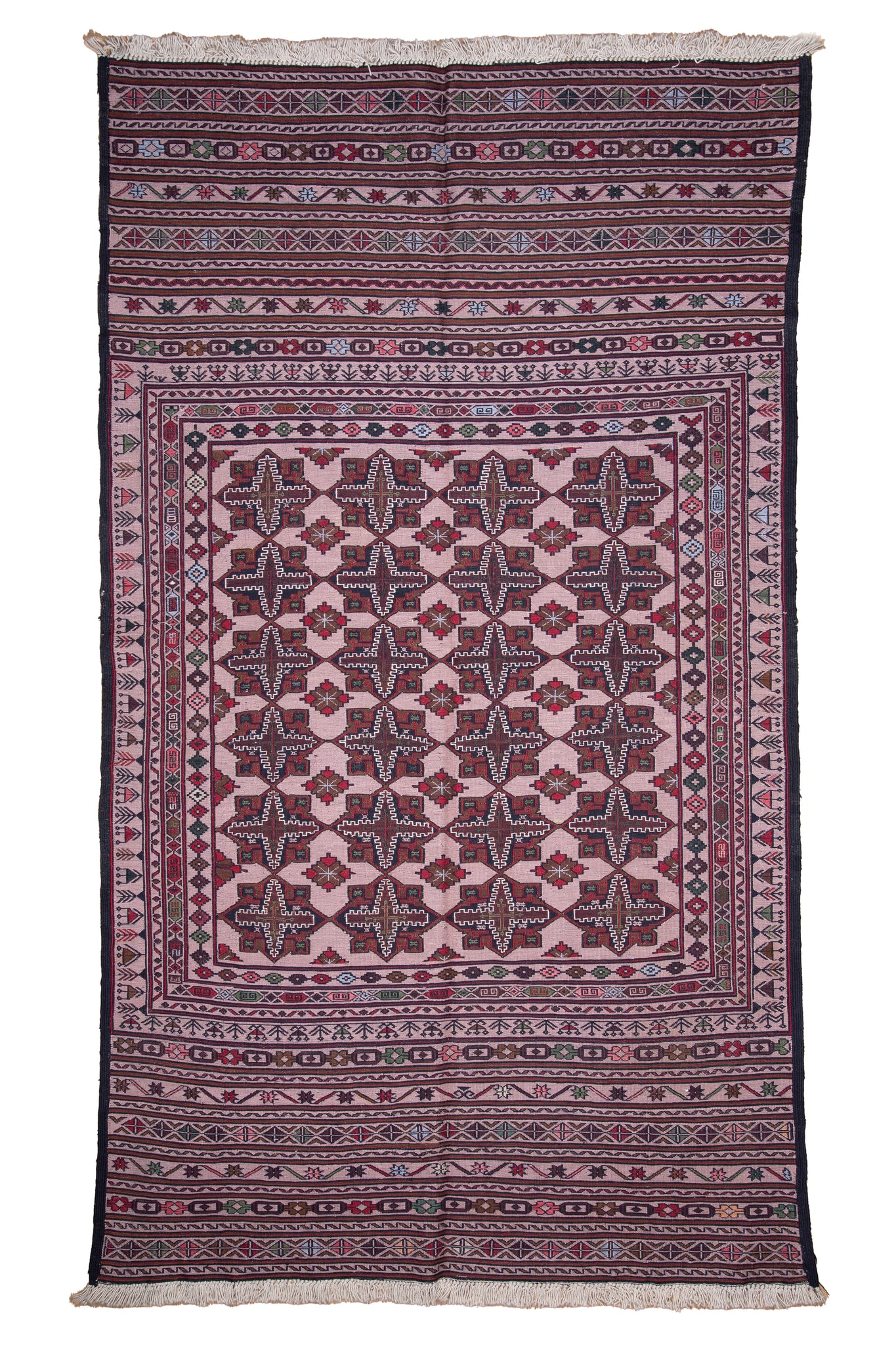Handwoven with exceptional artistry, this Balochi tribal rug features a rare blush-pink field accented by intricate tree-like motifs and floral rosettes in burgundy, black, and emerald. Each motif is meticulously aligned in rhythmic symmetry, reflecting traditional Baloch symbolism of life and growth. The borders are adorned with finely executed geometric and vine patterns, layered in soft rose and jewel tones, creating a tapestry of heritage and sophistication. Crafted from high-quality wool using age-old weaving techniques, this rug is a collector's dream—perfect for both refined contemporary spaces and cultural interiors. A bold yet elegant tribute to nomadic craftsmanship and tribal identity.