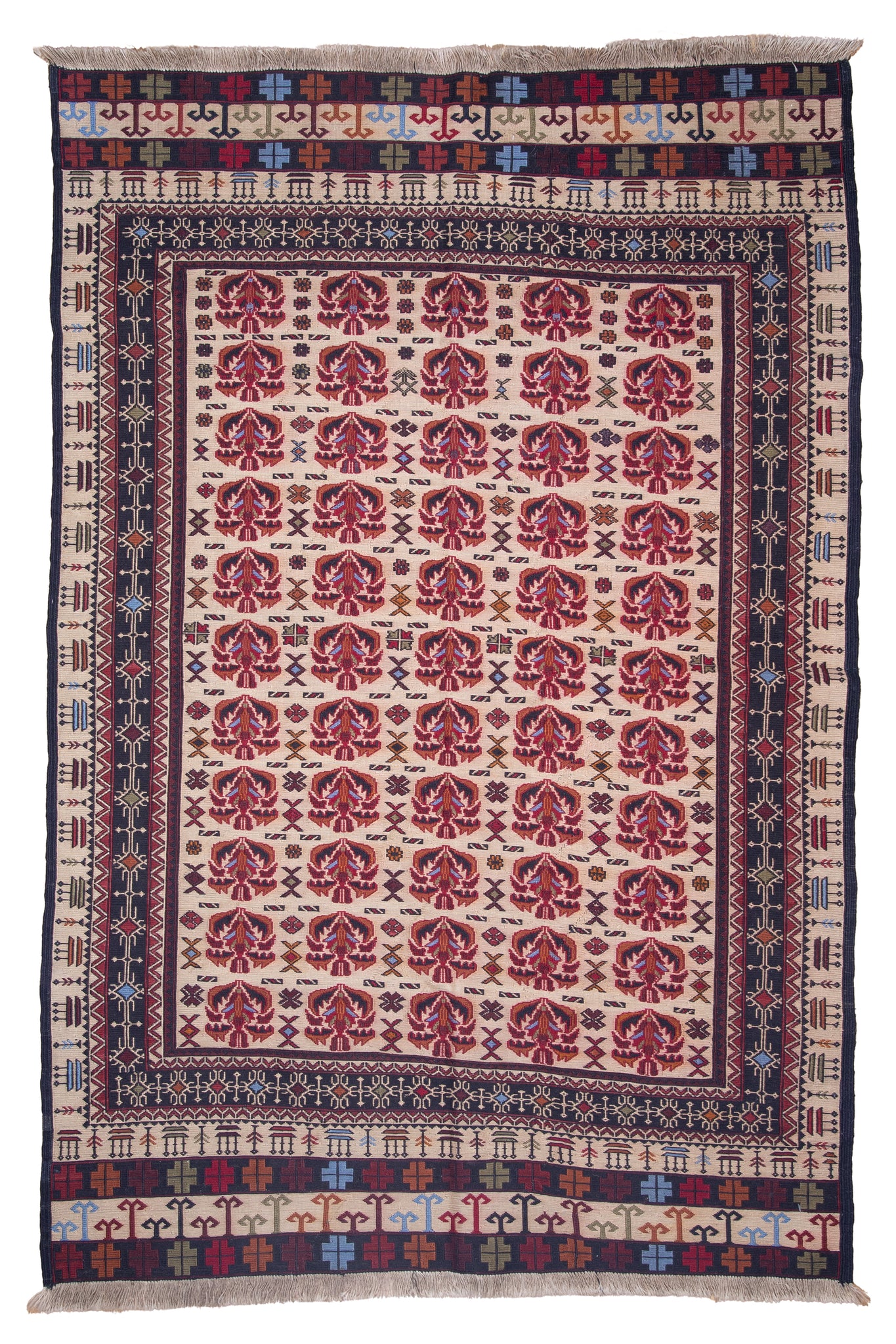 This stunning Maliki kilim rug from Afghanistan brings a joyful burst of colour and pattern to any space. Handwoven in fine wool using traditional flatweave techniques, it features rows of vivid rose-like floral motifs in crimson, fuchsia, and aubergine on a warm ivory base. Delicately bordered with tribal lattice and symbolic forms in indigo, ochre, and blue, the design radiates harmony and vibrance. The outermost band—bold and colorful—grounds the composition with a visual flourish. A perfect balance of artistry and heritage, this kilim is ideal for collectors and tastemakers seeking authentic, handcrafted décor with rich Afghan cultural storytelling woven in.