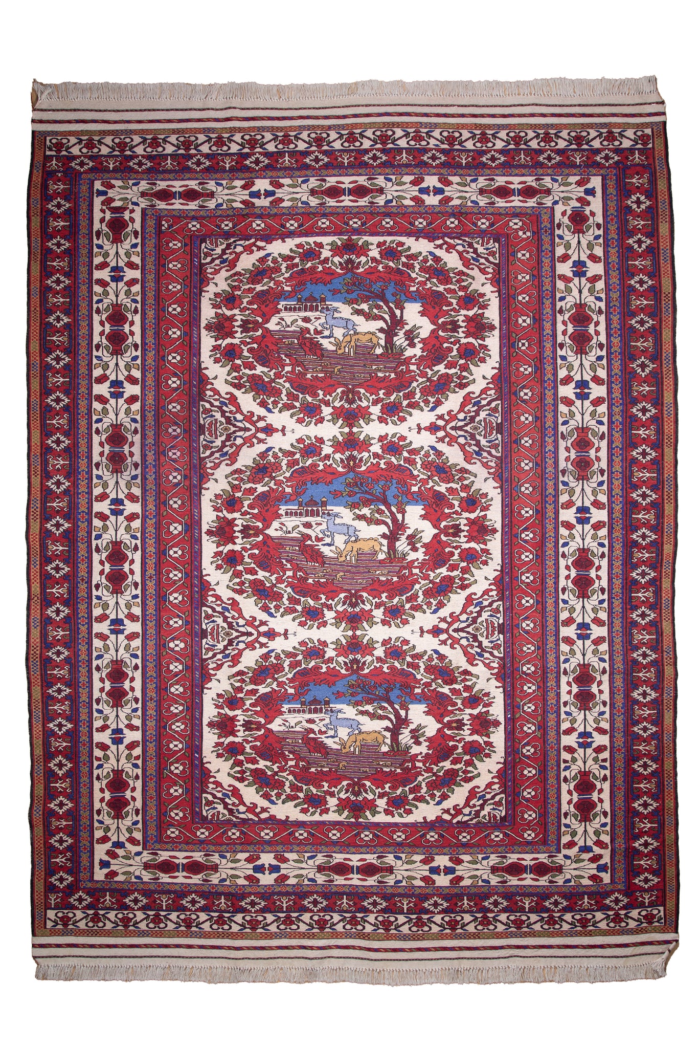 This Soumak Maliki kilim from Herat, Afghanistan, is a breathtaking blend of artistic storytelling and technical brilliance. Woven using the intricate Soumak technique, it showcases vivid pastoral medallions framed by lush floral motifs—depicting a tranquil countryside with grazing animals, ancient ruins, and trees of life. Crafted from fine handspun wool and dyed with rich natural pigments, its palette of deep crimson, ivory, sapphire, and gold evokes timeless elegance. With its tapestry-like quality and pictorial detail, this kilim transcends decor to become a visual narrative. A rare collectible, it embodies the heritage of Herat's weavers and the enduring soul of Afghan craftsmanship.