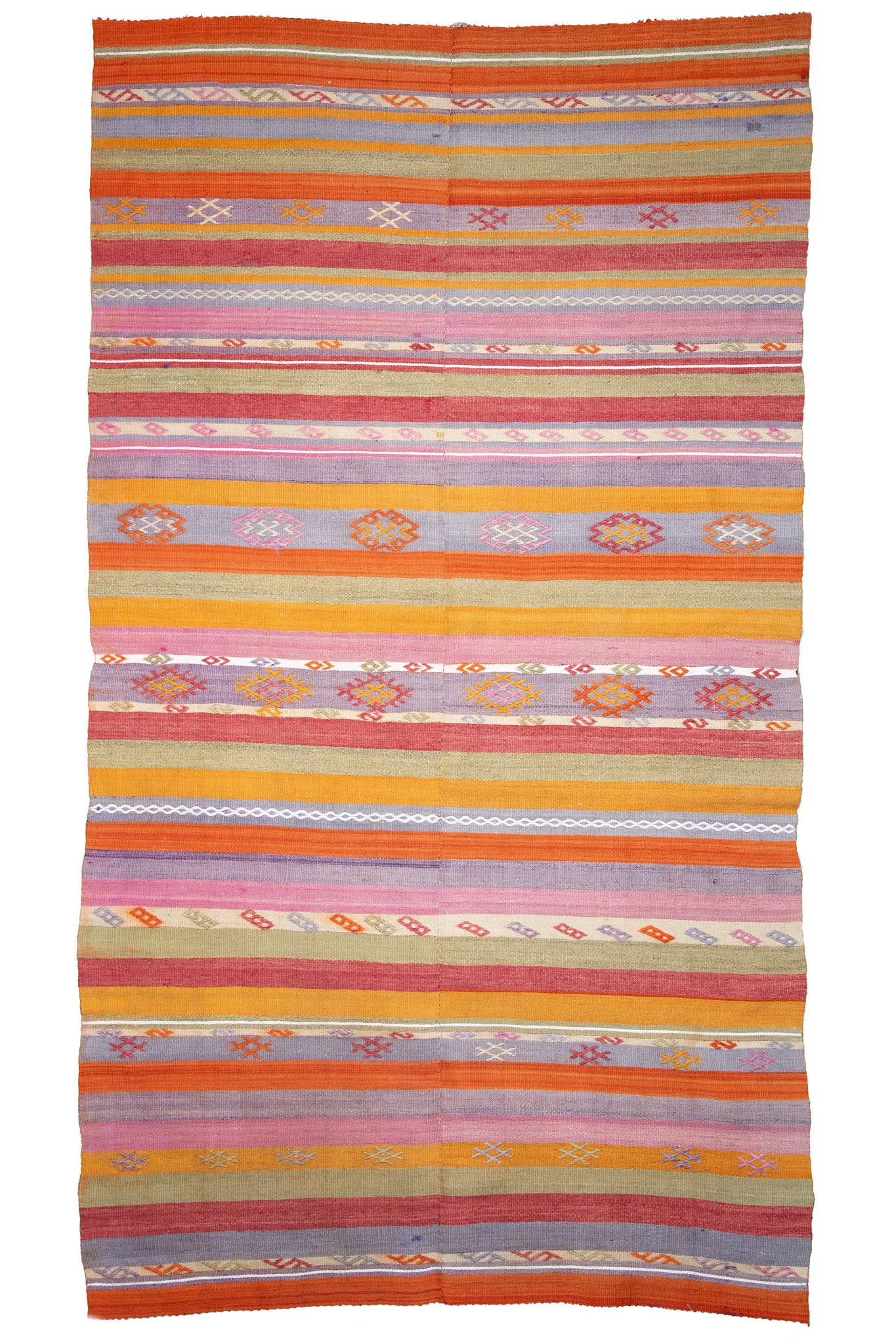 Bursting with joyful energy, this handcrafted Shirazi kilim is a vibrant celebration of tribal artistry and cultural symbolism. Woven from handspun wool and dyed with natural pigments, it features a rhythmic interplay of horizontal stripes in radiant tones—sunset orange, rose pink, lavender, saffron, and olive. Interspersed with diamond motifs and ancestral symbols, each band tells a story rooted in Persian nomadic heritage. The flatweave texture is light, durable, and perfect for layering in eclectic or contemporary interiors. A rare find for collectors and design connoisseurs alike, this kilim brings warmth, heritage, and soulful character into any refined living space.