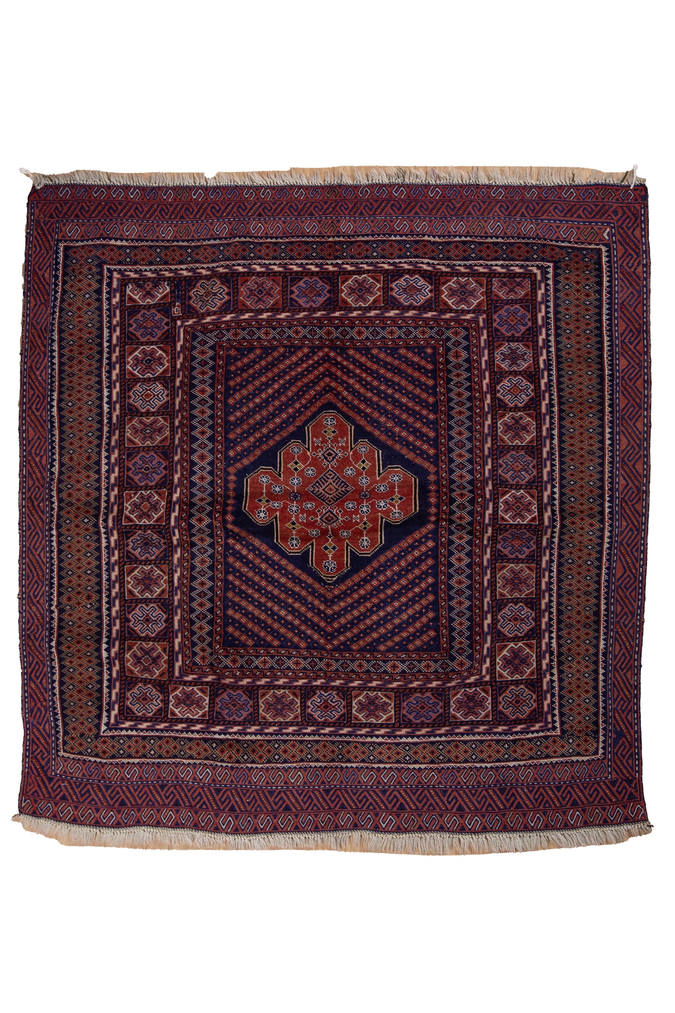 This exquisite Persian Afshar rug is a masterpiece of nomadic artistry, showcasing a vibrant central medallion in crimson and ivory, set against a richly patterned navy ground. Woven by hand using high-quality wool and natural dyes, its layout features intricate cross motifs and geometric panels—hallmarks of Afshar tribal design. The rug’s layered borders and precise symmetry create a dynamic visual rhythm, while the deep tones evoke heritage and strength. Each knot reflects generations of skill and storytelling, making it a true collector’s piece. Ideal for those who value cultural depth and timeless craftsmanship in their living or curated spaces.