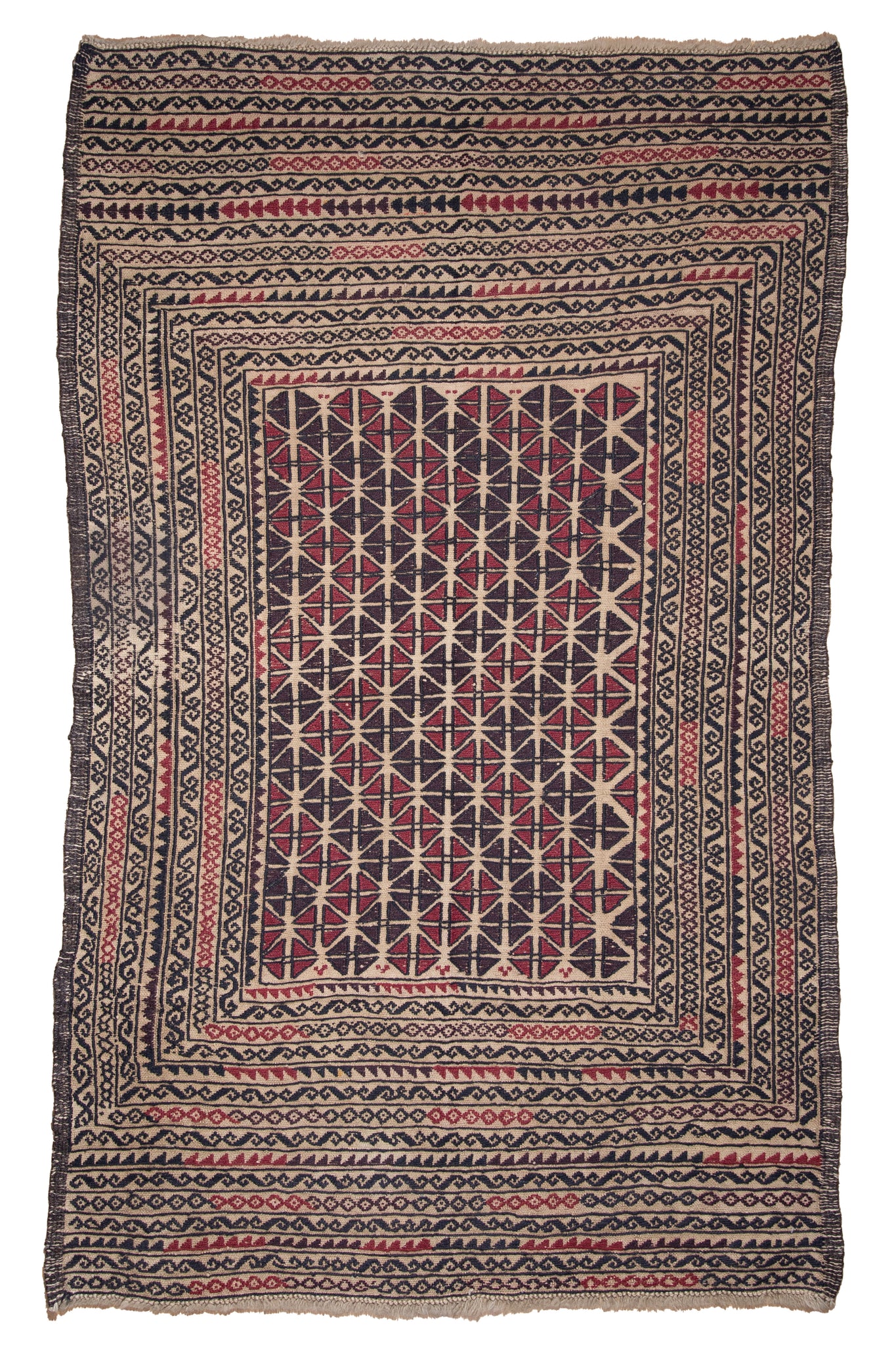 A rare treasure of tribal artistry, this antique Barjesta kilim is a masterful composition of symmetry and spirit. Handwoven using time-honored techniques, its central field is adorned with a lattice of radiant eight-pointed stars—symbols of protection and celestial harmony. The bold palette of indigo, ivory, and deep crimson speaks of natural dyes and enduring heritage. Surrounding geometric bands in rhythmic repetition draw the eye inward, echoing nomadic traditions passed down through generations. Crafted in wool with a unique combination of flat and raised weaving, this kilim offers depth, texture, and unmistakable character—an exquisite statement for collectors and design connoisseurs alike.