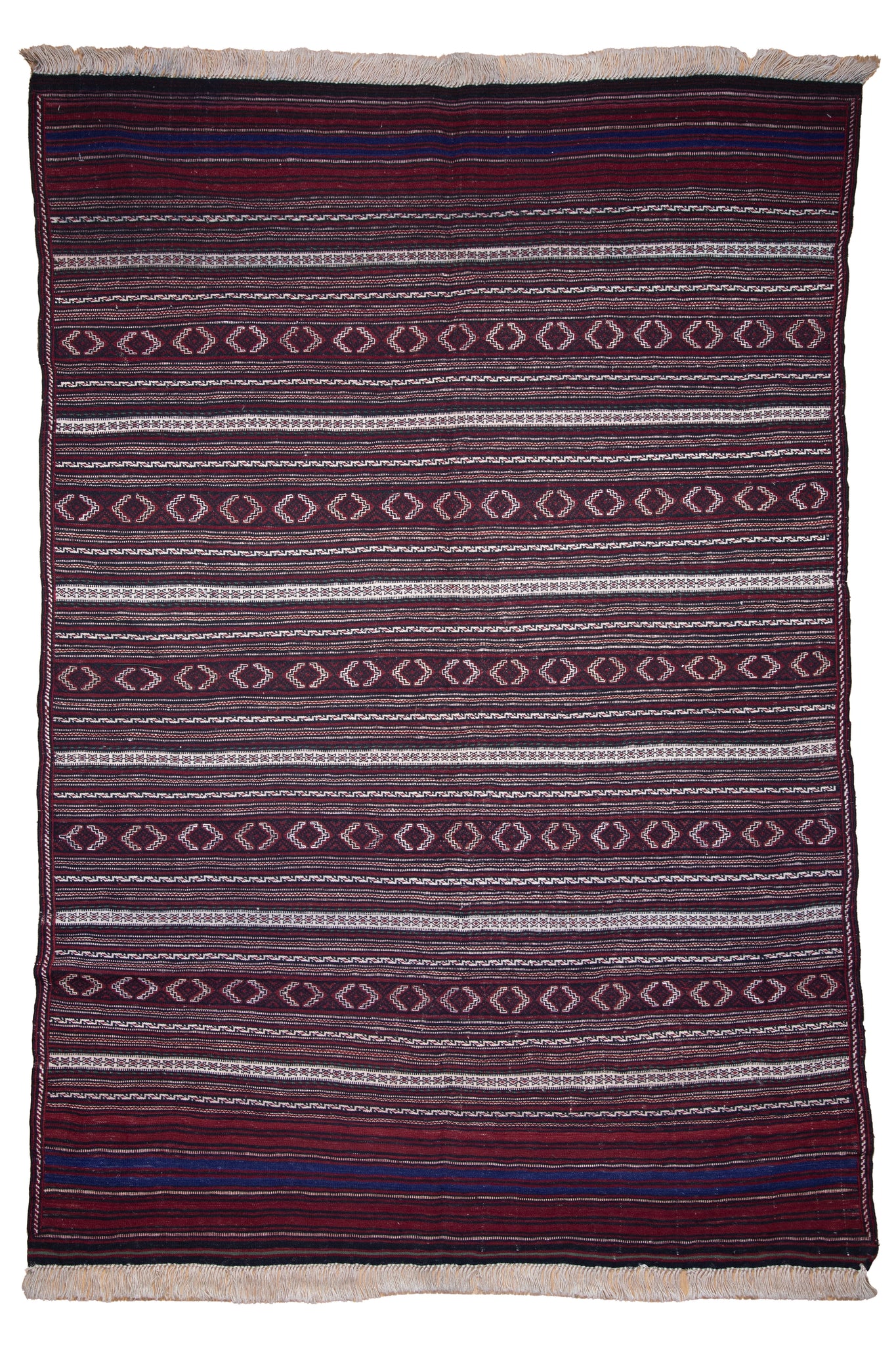 This elegant Maliki kilim from Afghanistan features a timeless striped layout infused with tribal heritage and subtle symbolism. Handwoven with handspun wool and dyed using traditional natural pigments, it showcases alternating bands of burgundy, ivory, indigo, and plum—each line interspersed with geometric motifs and zigzag accents. The repetition and rhythm of the design speak to nomadic influences, offering both visual harmony and textural appeal. Lightweight yet sturdy, this flatweave kilim is ideal for layering, wall hanging, or grounding modern interiors with heritage charm. A refined and earthy addition to any collection, it reflects the quiet sophistication of Afghan craftsmanship.
