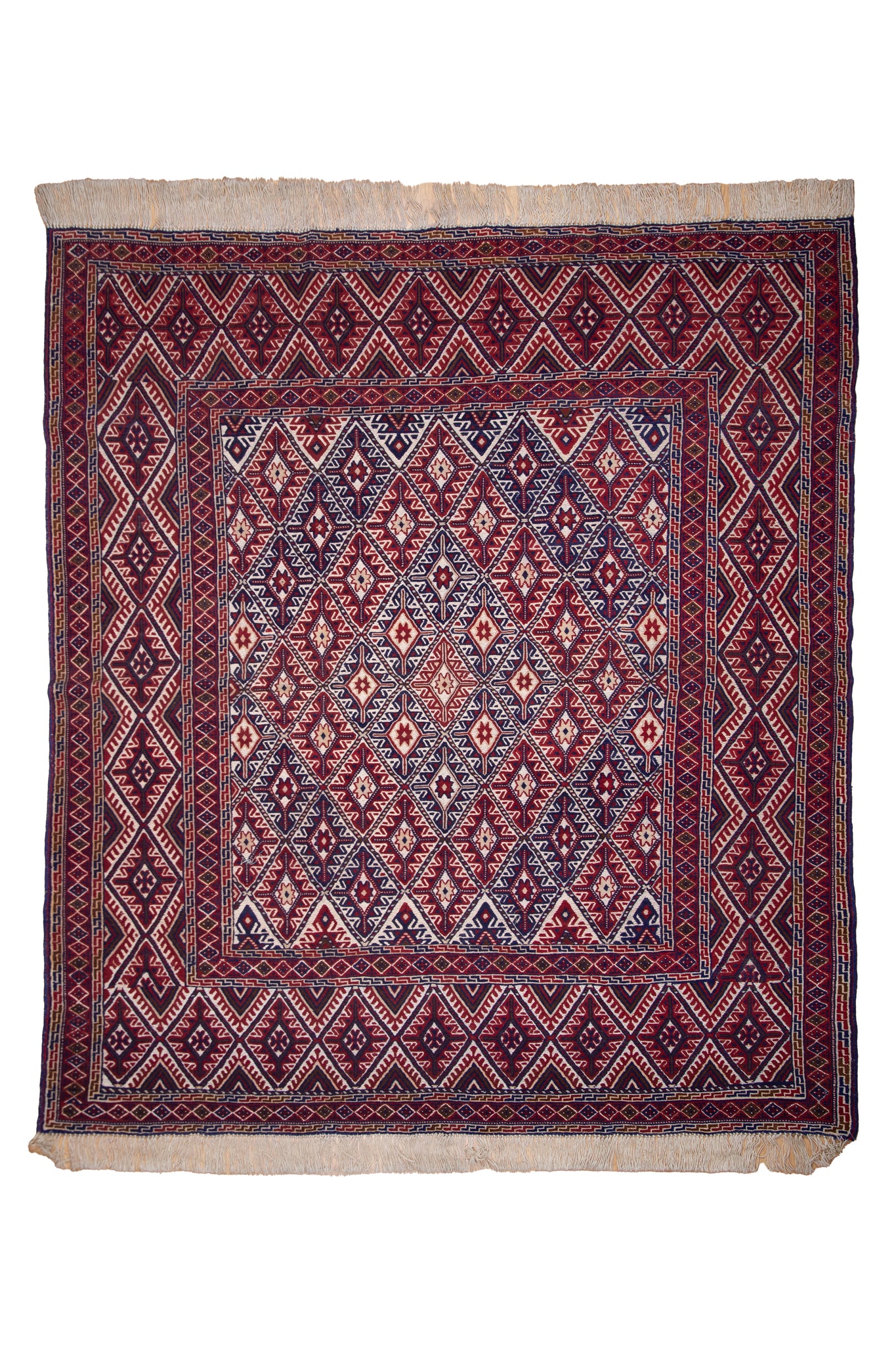 A captivating expression of tribal heritage, this Nakhunak kilim is handwoven with meticulous precision by Afghan artisans. Crafted from highland wool and dyed with natural pigments, it showcases a dense lattice of elongated diamonds in crimson, ivory, and midnight blue—each symbol a protective talisman in nomadic tradition. The rhythmic geometry and striking symmetry are framed by multiple borders, enhancing the visual depth and narrative richness. Both a collector's gem and a design statement, this kilim embodies the rugged refinement of the highlands. Its flatweave construction ensures durability, making it ideal for sophisticated interiors seeking culture, craftsmanship, and enduring tribal artistry.