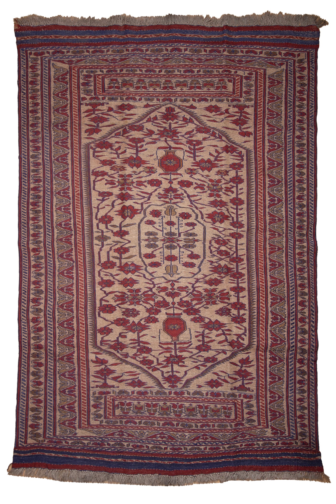 This vintage Afghani Barkesta kilim is a radiant example of tribal storytelling woven into textile form. Featuring a medallion-inspired layout framed by serrated leaf borders and floral geometry, it is flatwoven in the classic kilim technique, ensuring both strength and finesse. Earthy tones of rosewood, madder red, and indigo elegantly contrast a soft beige field, all dyed using natural pigments. Woven from handspun wool, the texture feels organic and enduring. Every motif holds symbolic depth—guardianship, fertility, and harmony. A rare find for connoisseurs, this kilim blends utility and beauty, preserving centuries of nomadic heritage in a single, stunning floor tapestry.