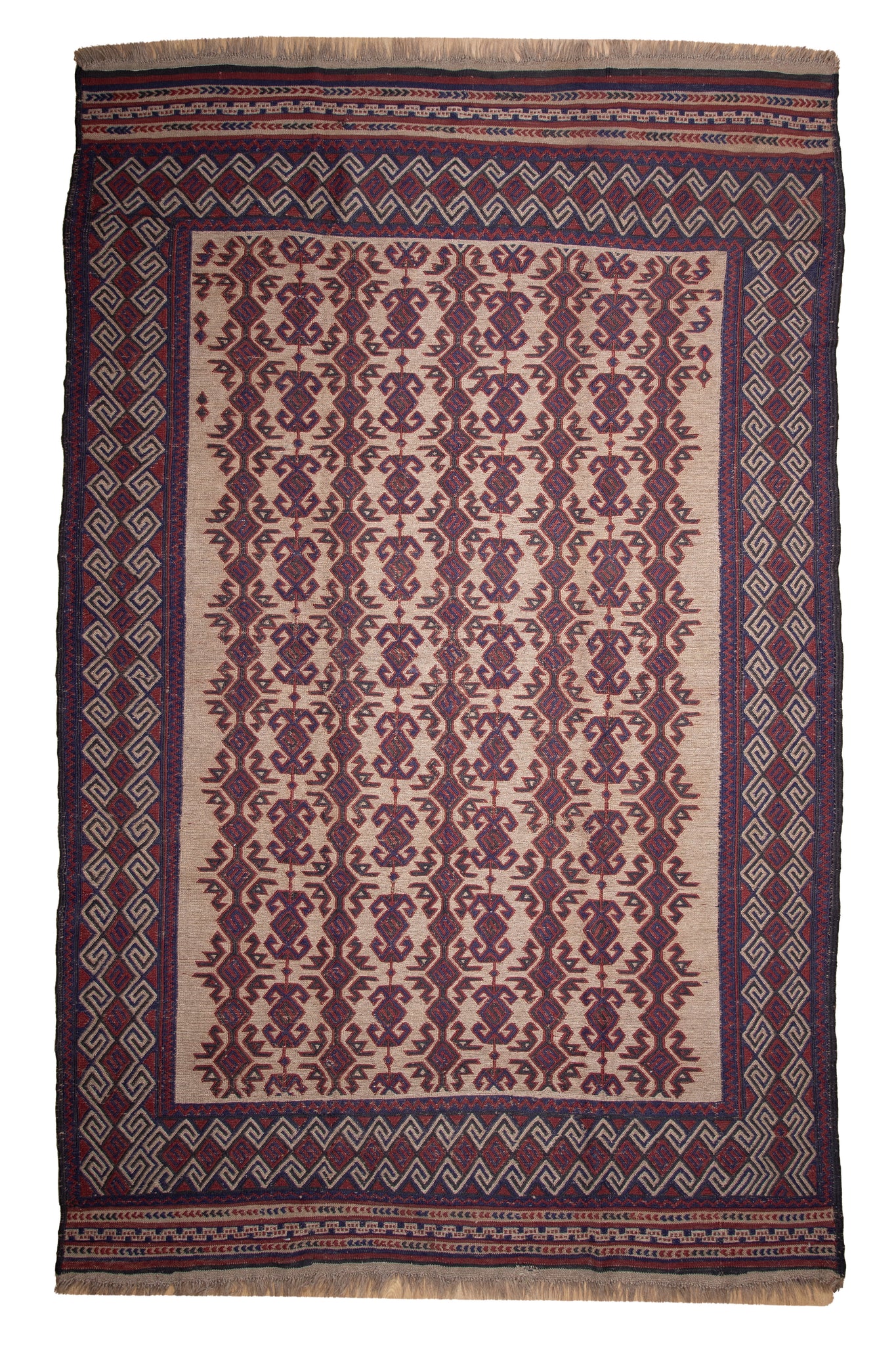 This vintage Afghani kilim is a testament to tribal elegance, handwoven with meticulous detail and timeless symbolism. The central field features rows of stylized bird and flower-like motifs in deep burgundy and aubergine, set against a soft sand-toned ground—each figure a subtle nod to nature and fertility. Encased in a bold geometric border of interlocking zigzags and angular vines, the design creates a harmonious dialogue between movement and stillness. Crafted from handspun wool and colored with natural dyes, the kilim exudes both warmth and authenticity. Ideal for collectors seeking refined tribal artistry and meaningful, heirloom-quality craftsmanship.