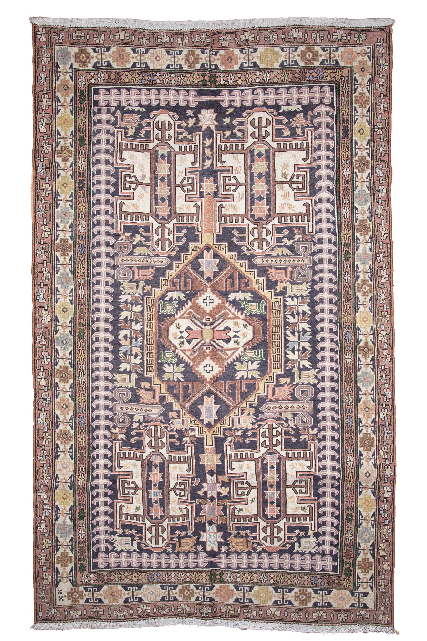 This vintage Caucasian Soumak kilim is a masterclass in flatweave artistry, showcasing the region’s iconic tribal geometry and symbolic motifs. Handwoven using age-old tapestry techniques, it features bold latch-hook medallions, stylized rams’ horns, and intricate stepped patterns that speak of ancient cultural narratives. The palette—an elegant blend of muted indigo, terracotta, ivory, and soft peach—brings warmth and vibrancy without overwhelming. Crafted entirely in wool, its tightly woven structure ensures both visual depth and enduring durability. Lightweight yet richly detailed, this kilim is a striking piece of functional art—ideal for collectors or designers seeking authentic, nomadic charm with timeless sophistication.