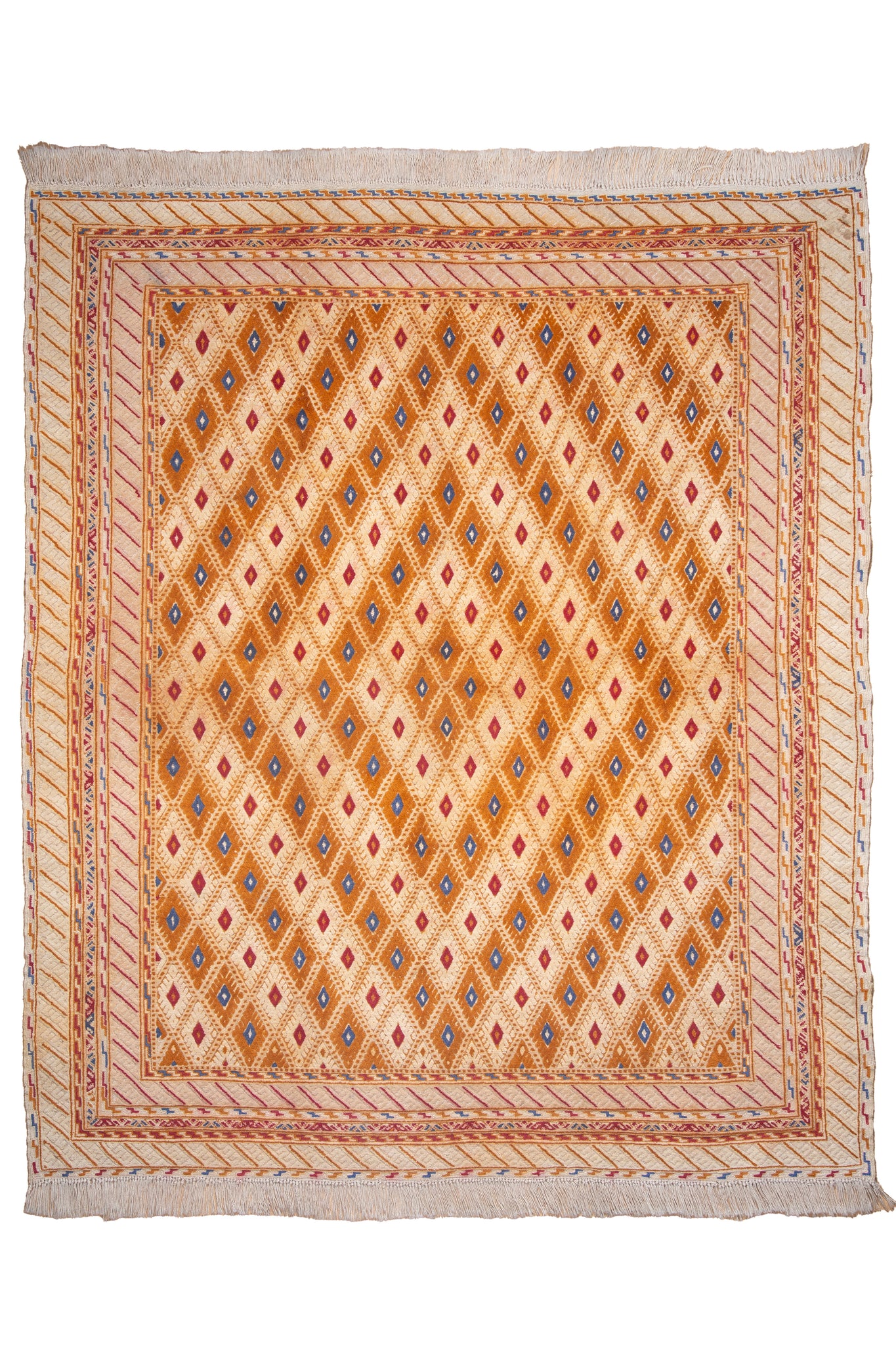 An exquisite rarity, this vintage Afghani Nakhunak kilim seamlessly fuses pile and flatweave techniques—an artistic hallmark of nomadic ingenuity. Its shimmering field of golden ochre, coral red, and cobalt blue diamonds is framed by softly striated ivory borders, all rendered in handspun wool and natural dyes. The interplay of textures—looped pile meeting the smoothness of slit weave—adds remarkable depth and tactile sophistication. Woven by tribal artisans, each motif reflects a symbol of prosperity and protection. This kilim is more than décor—it’s a living artifact, marrying heritage with innovation, destined to elevate refined interiors and discerning textile collections.
