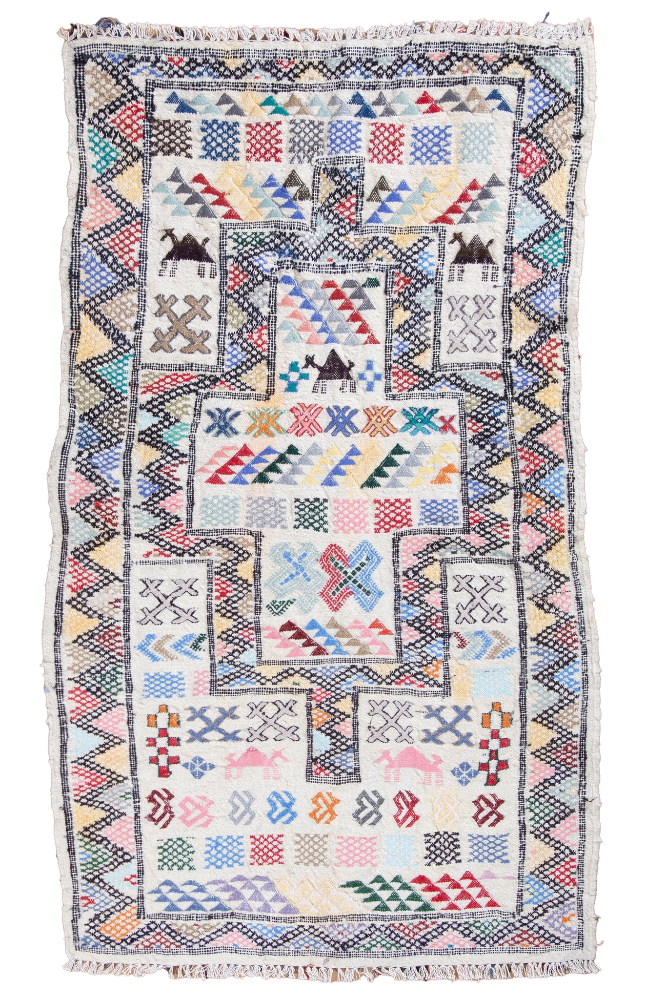 Bursting with vibrance and symbolism, this Moroccan kilim is a handcrafted celebration of Berber heritage and imagination. Woven from natural wool and dyed with vivid, earthy pigments, the design features ancestral symbols—crosses for protection, camels for endurance, and diamonds for fertility—arranged within a maze-like structure. Each shape and color tells a story, set against a soft ivory field that amplifies the rug's folk-art charm. Lightweight yet durable, this kilim is ideal for brightening eclectic, boho, or globally inspired spaces. A one-of-a-kind textile treasure, it merges ancient storytelling with playful color, offering both heritage and contemporary appeal in every thread.