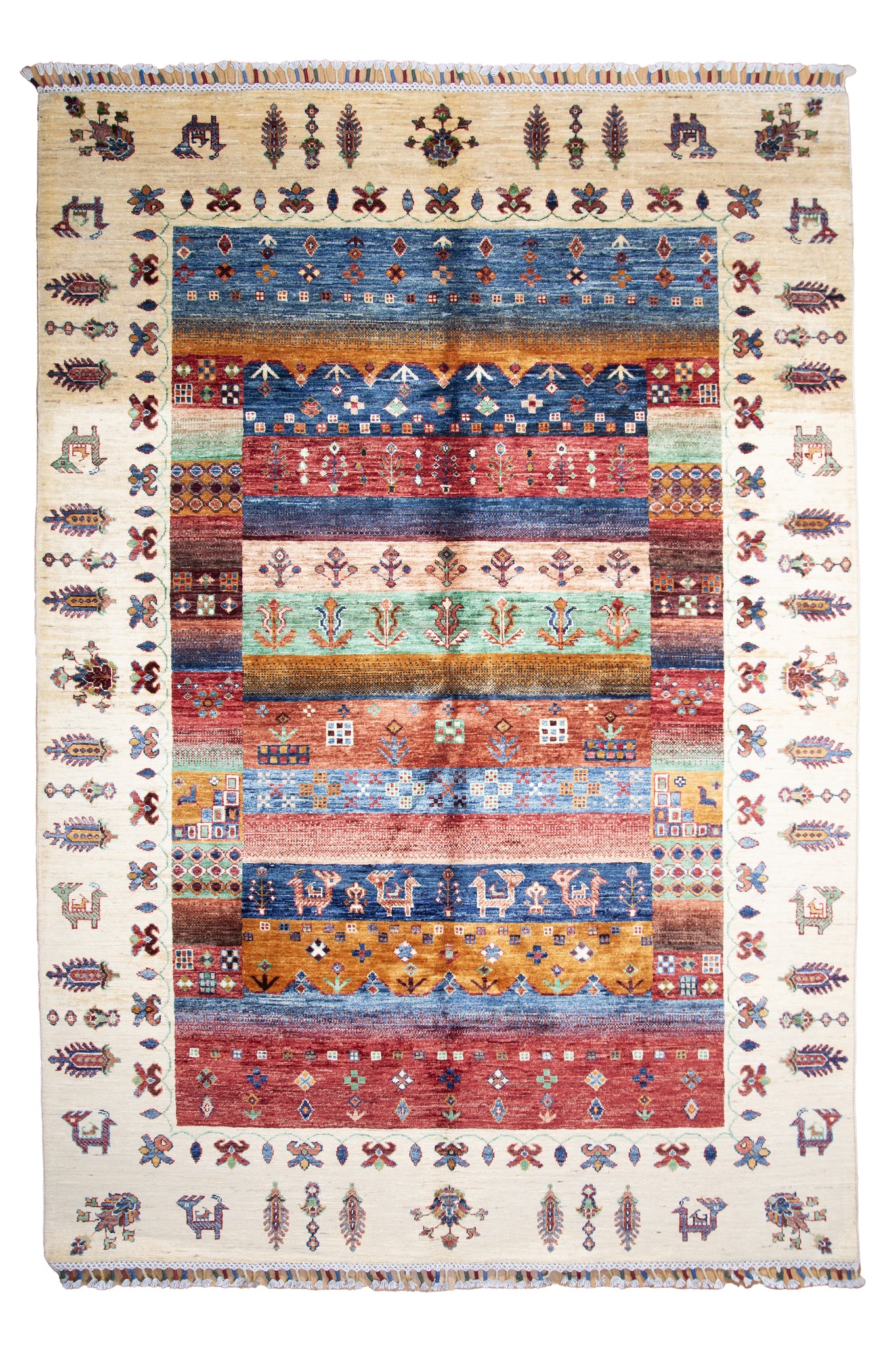 Bursting with color and tribal soul, this Afghan Zeigler rug is a visual ode to nomadic artistry. Its ivory border frames a vivid central field adorned with symbolic bands—each representing flora, fauna, and folkloric motifs hand-knotted with precision. Rich hues of crimson, lapis, saffron, and jade shimmer against a soft Ghazni wool pile, dyed using natural minerals and plant-based extracts. The ivory edge, detailed with stylized animals and rosettes, adds brightness and contrast, enhancing the visual rhythm. A rare fusion of rustic tradition and refined craftsmanship, this rug is perfect for collectors seeking authentic character with timeless decorative elegance.