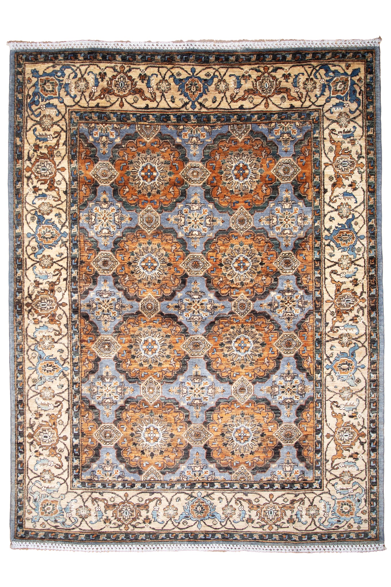 A true testament to regal elegance, this Afghan Zeigler rug showcases an intricately repeated medallion pattern set against a steel blue field with warm rust accents. Each motif is meticulously hand-knotted from premium Ghazni wool, offering a rich, velvety pile and superb longevity. The ivory border is delicately laced with floral vines and rosettes, framing the central design with refined symmetry. Inspired by classical Persian architecture and Mughal artistry, its palette is both bold and balanced—perfect for enhancing grand interiors. A rare piece that blends tradition with visual grandeur, this rug is a collector’s dream and a statement of timeless sophistication.