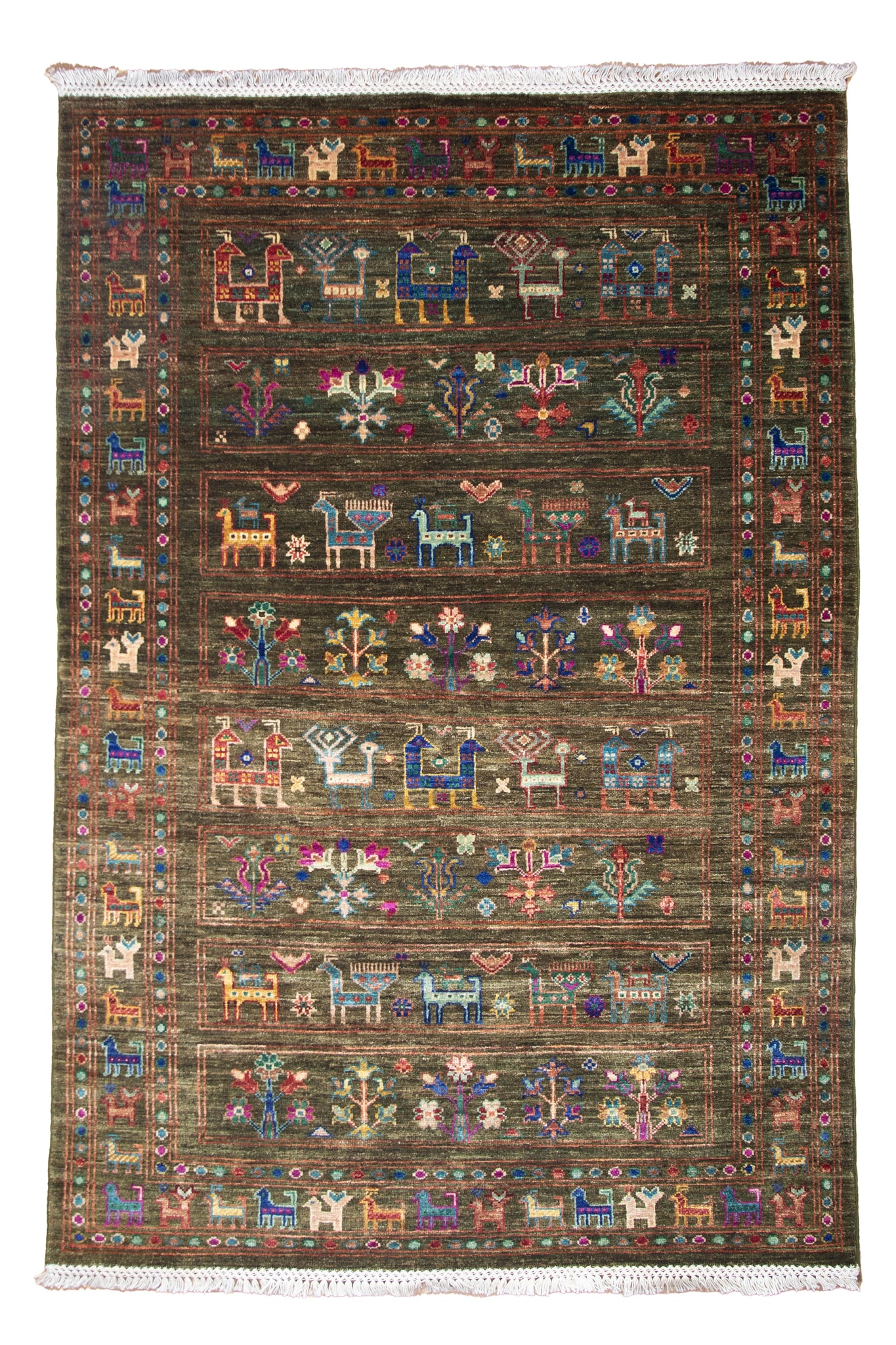A captivating blend of heritage and artistry, this Afghan Zeigler rug features a lush olive-green field adorned with vibrant tribal motifs. Hand-knotted from the finest Ghazni wool, its supple texture and enduring sheen speak to the quality of its craftsmanship. Rows of stylized animals, blooming flora, and geometric emblems evoke ancient nomadic symbolism, rendered in jewel-toned hues—sapphire blue, ruby red, saffron, and ivory. The meticulous symmetry and dynamic palette breathe life into every inch of this rug. A rare piece that balances rustic charm with refined execution, it’s ideal for collectors seeking depth, narrative, and timeless character in their interiors.