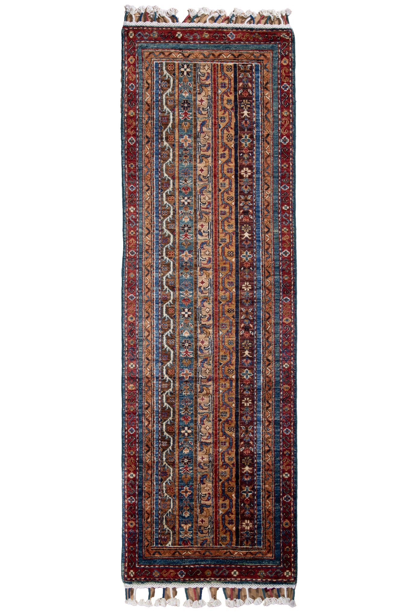 This hand-knotted Zeigler Afghan runner embodies tribal charm with its rhythmic vertical stripe pattern, drawing from nomadic motifs of the Caucasus and Central Asia. Woven from lustrous Ghazni wool, its earthy palette of rust, ochre, turquoise, and deep indigo creates a harmonious interplay of tone and form. Each stripe reveals a story—of protective talismans, geometric vines, and ancestral borders—all framed in a richly detailed edge. Perfect for hallways or transitional spaces, this runner offers both functionality and heritage. A true connoisseur's piece, it celebrates tradition with enduring artistry, adding a grounded elegance to refined interiors. Rare, balanced, and unmistakably handwoven.