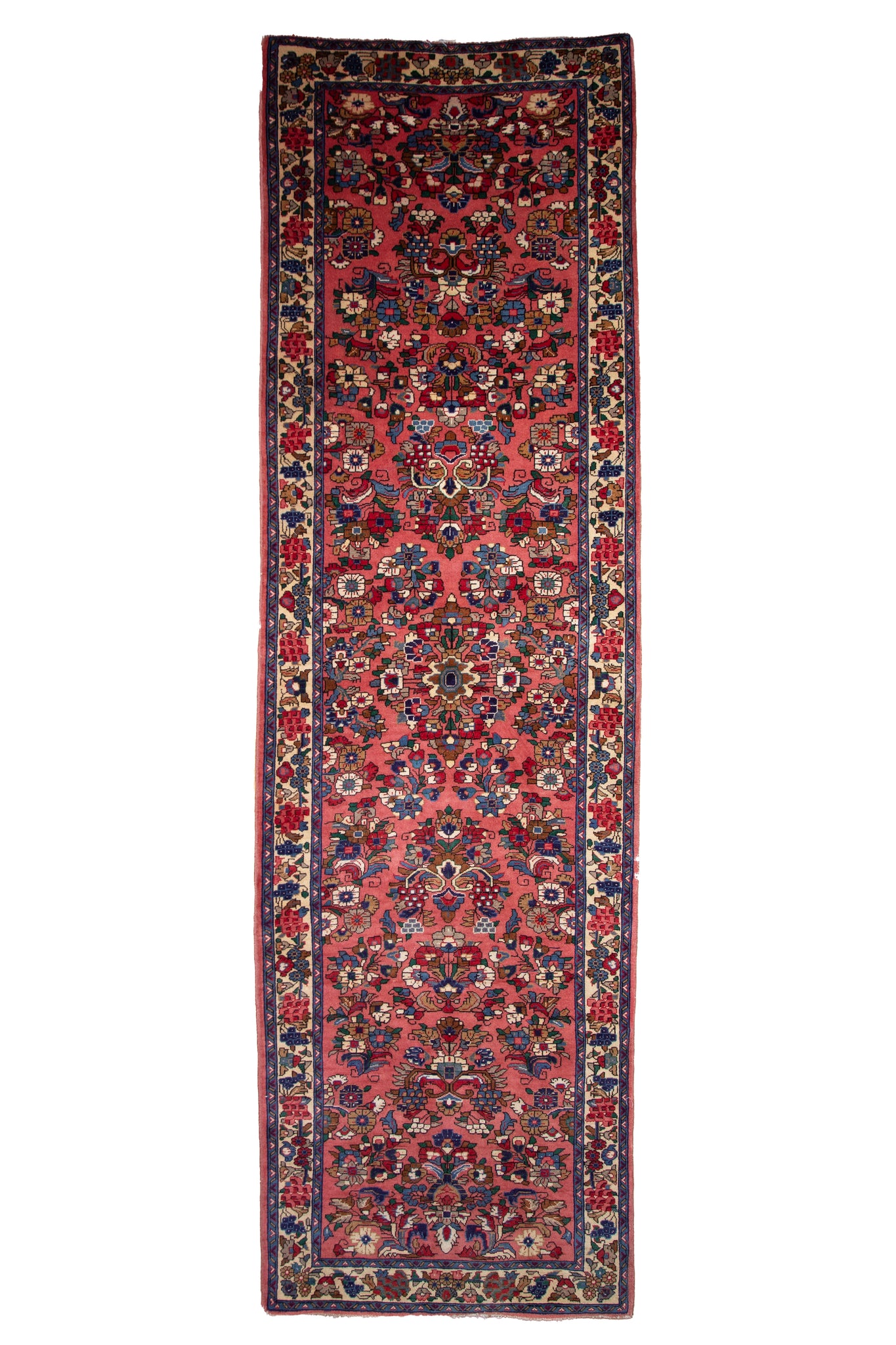 This exquisite antique Persian Sarouk runner is a true testament to early 20th-century rug artistry, hand-knotted in fine wool with exceptional finesse and balance. Characterized by its coral-red field, the rug features a dense array of floral sprays, palmettes, and rosettes that seem to bloom endlessly across its surface. Rich tones of navy, ivory, emerald, and indigo are harmoniously woven, creating a dynamic, symmetrical flow ideal for elegant corridors or gallery spaces. The delicate ivory border, adorned with a stylized blossom-and-vine motif, perfectly frames the central composition, enhancing its classical Persian charm. Celebrated for their durability and formal beauty, Sarouk rugs like this one were traditionally crafted for aristocratic homes, making this piece both a functional runner and a collectible heirloom. With its deep cultural roots and radiant palette, this rug embodies timeless sophistication, ideal for discerning collectors and those curating interiors that honour heritage, authenticity, and handcrafted excellence.