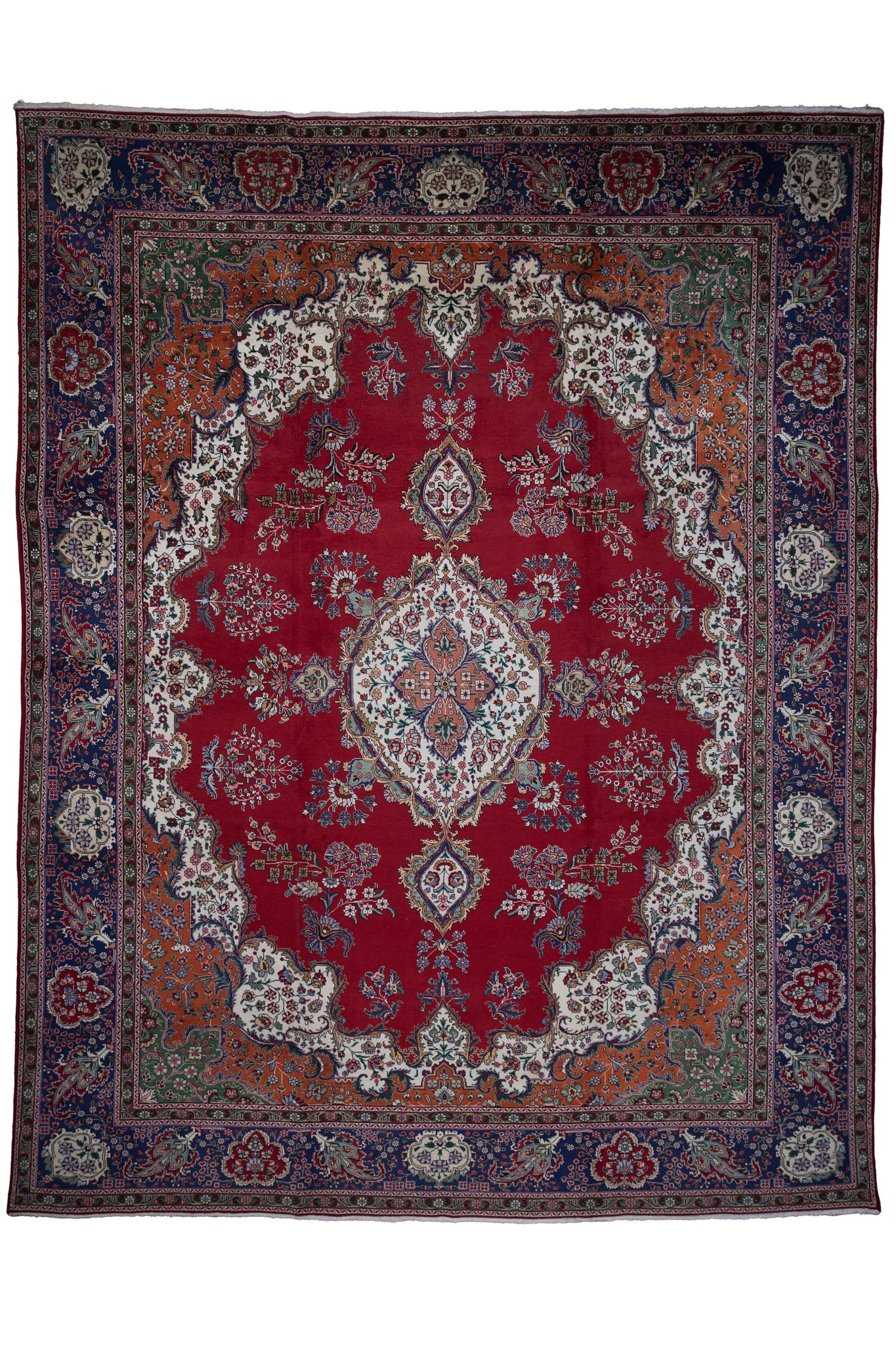 This masterfully woven Tabriz wool rug captures the essence of classical Persian elegance. Set against a regal crimson field, the central medallion blooms with delicate floral motifs in ivory, sky blue, and coral, creating a refined sense of balance. Intricate vine scrolls and corner spandrels enhance the symmetrical layout, all framed by a rich indigo border adorned with botanical arabesques. Crafted in fine wool with a tight, durable weave, this piece embodies both beauty and longevity. A timeless expression of Iranian artistry, it is perfect for collectors or connoisseurs seeking a statement rug with cultural depth and distinguished heritage.