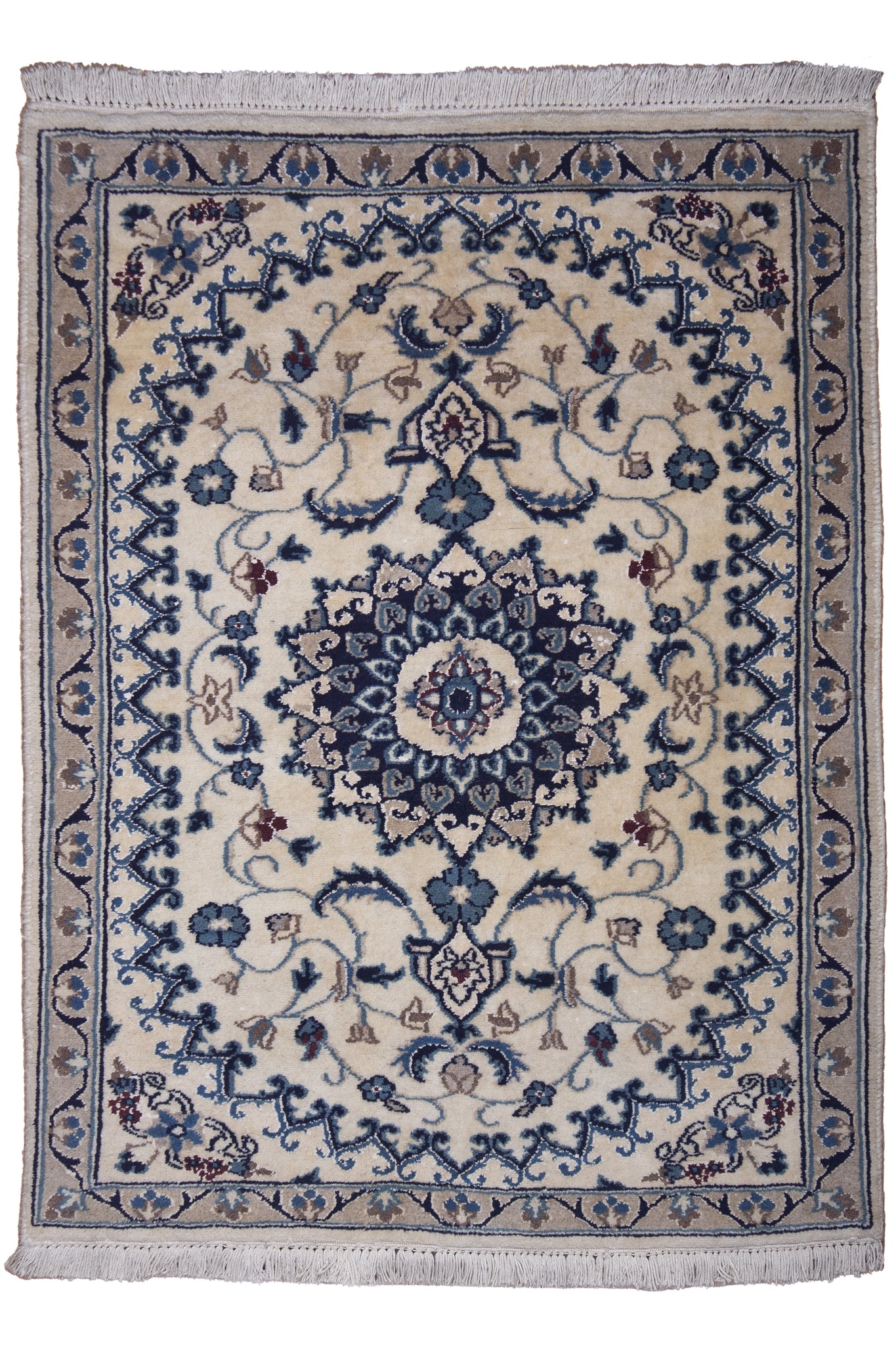 This exquisite Persian Nain rug exemplifies timeless refinement with its intricately knotted medallion design and serene ivory background. Handwoven with precision in the city of Nain, Iran, it features soft wool and silk highlights that lend a gentle sheen to its delicate blue and slate-grey floral motifs. The elegant symmetry of vines and blossoms radiates from the central rosette, evoking a sense of balance and classical beauty. Every detail reflects the high knot density and artisan skill characteristic of Nain craftsmanship. Ideal for sophisticated interiors, this piece brings enduring grace, cultural richness, and understated opulence to any curated living space.