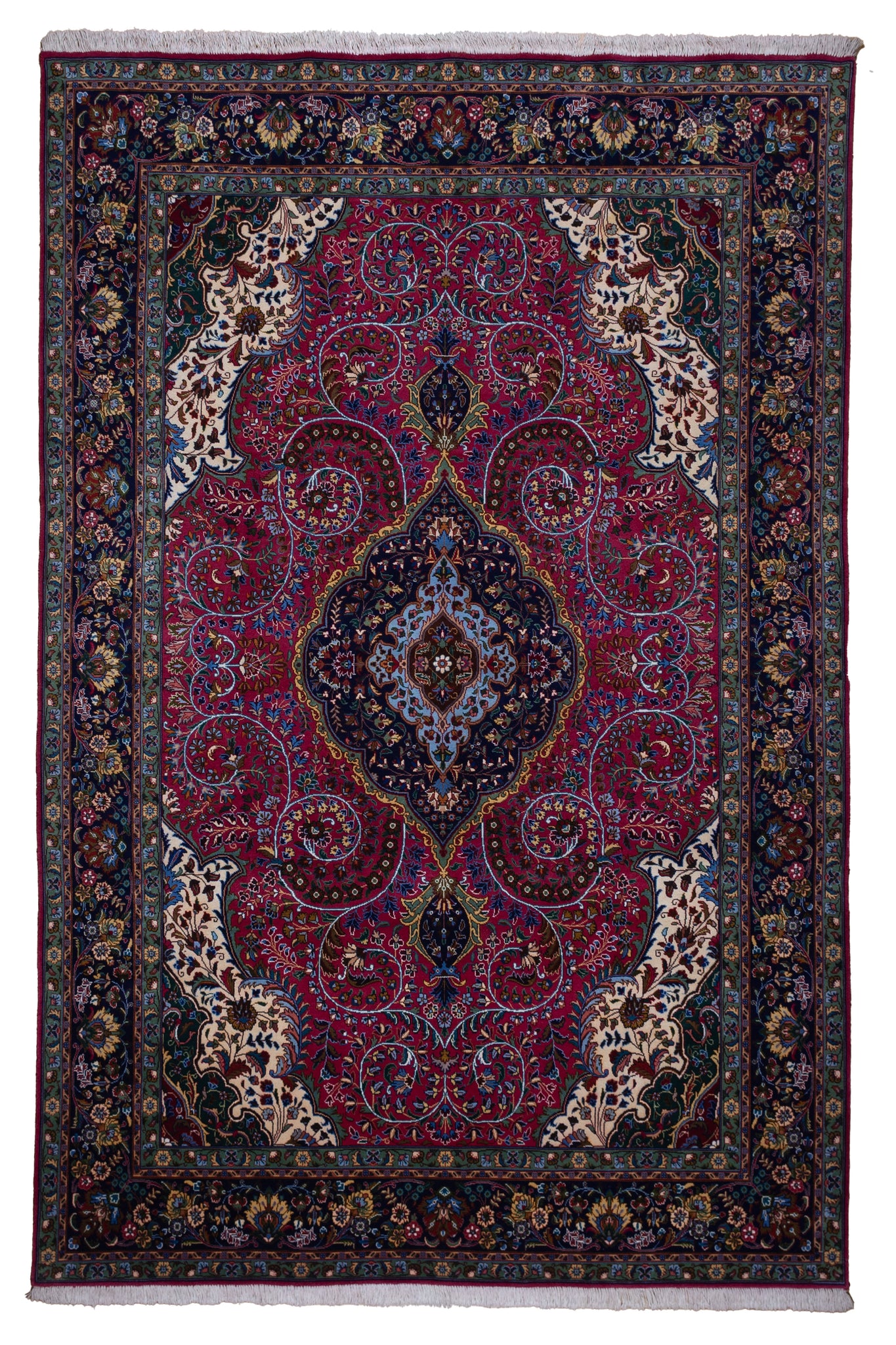 This opulent Tabriz wool rug exemplifies the pinnacle of Persian weaving tradition, renowned for its precision, balance, and breathtaking detail. Hand-knotted in high-grade wool, the rug features a striking central medallion enveloped in an intricate arabesque of floral scrolls and delicate vinery. The radiant crimson field is harmoniously contrasted by ivory spandrels and a midnight blue border blooming with blossoms in sapphire, emerald, and gold. Each element is meticulously composed to reflect the design sophistication for which Tabriz rugs are revered. The palette is both regal and romantic, evoking the grandeur of royal courts and the timeless elegance of Persian gardens. With an exceptionally fine weave and tactile richness, this heirloom-quality piece is not just a floor covering but a work of collectible art. Ideal for formal living rooms or curated interiors, it invites admiration and storytelling. A statement of enduring beauty, this Tabriz rug embodies artistic heritage and luxury refinement.