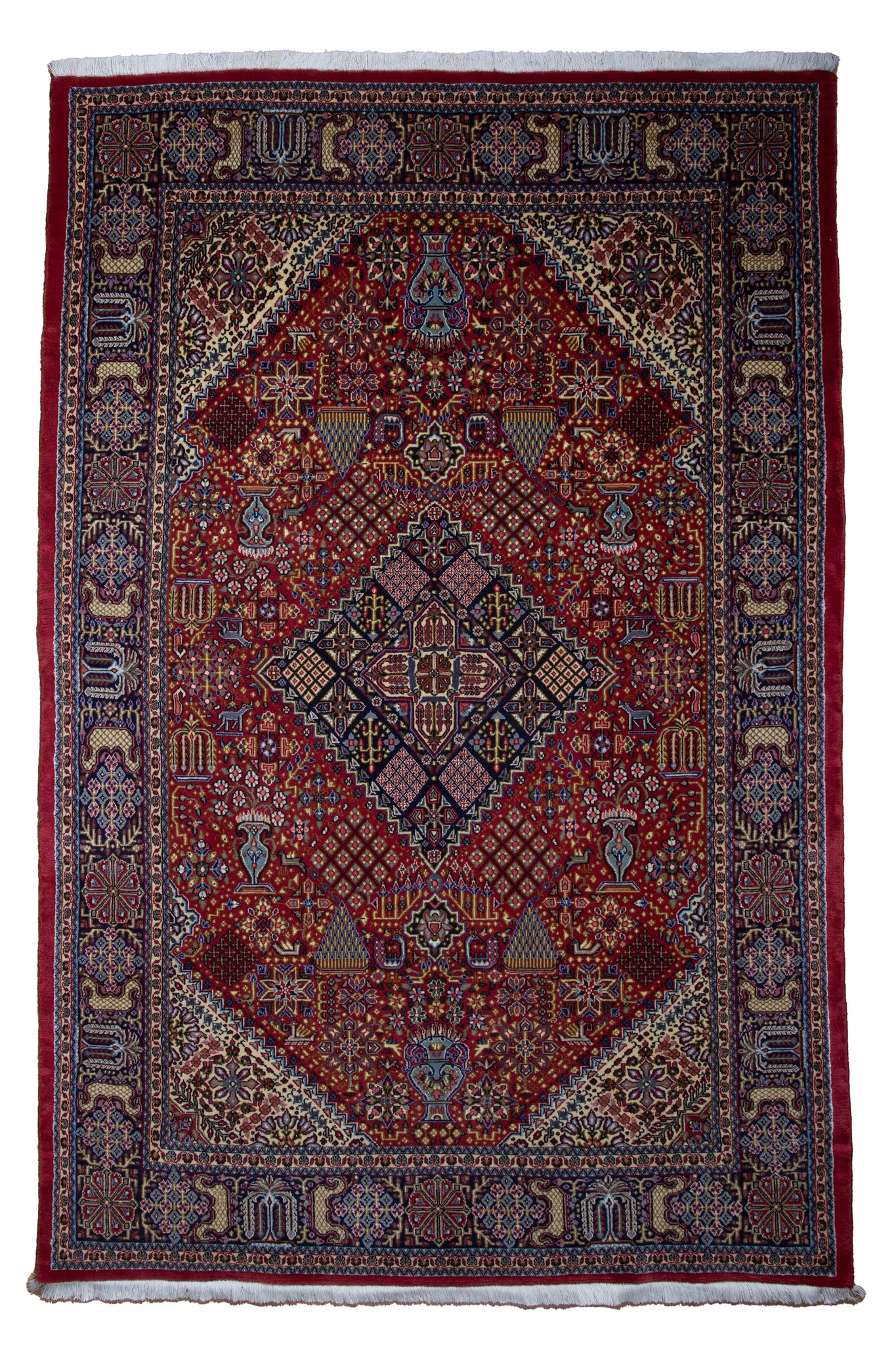 A rare tribute to Persian village artistry, this hand-knotted Joshqan rug dazzles with its geometric precision and architectural beauty. Woven using fine wool, it features a complex medallion set within a field of latticework, stylized vases, and symbolic flora—each motif echoing ancient Zoroastrian influences. The rich crimson base is enriched with cobalt, ivory, and ochre accents, while the stepped borders frame the composition with rhythmic harmony. Known for their structural clarity and cultural symbolism, Joshqan rugs are prized by collectors. This piece offers timeless elegance, heritage, and warmth—perfect for interiors seeking both visual depth and enduring Persian craftsmanship.