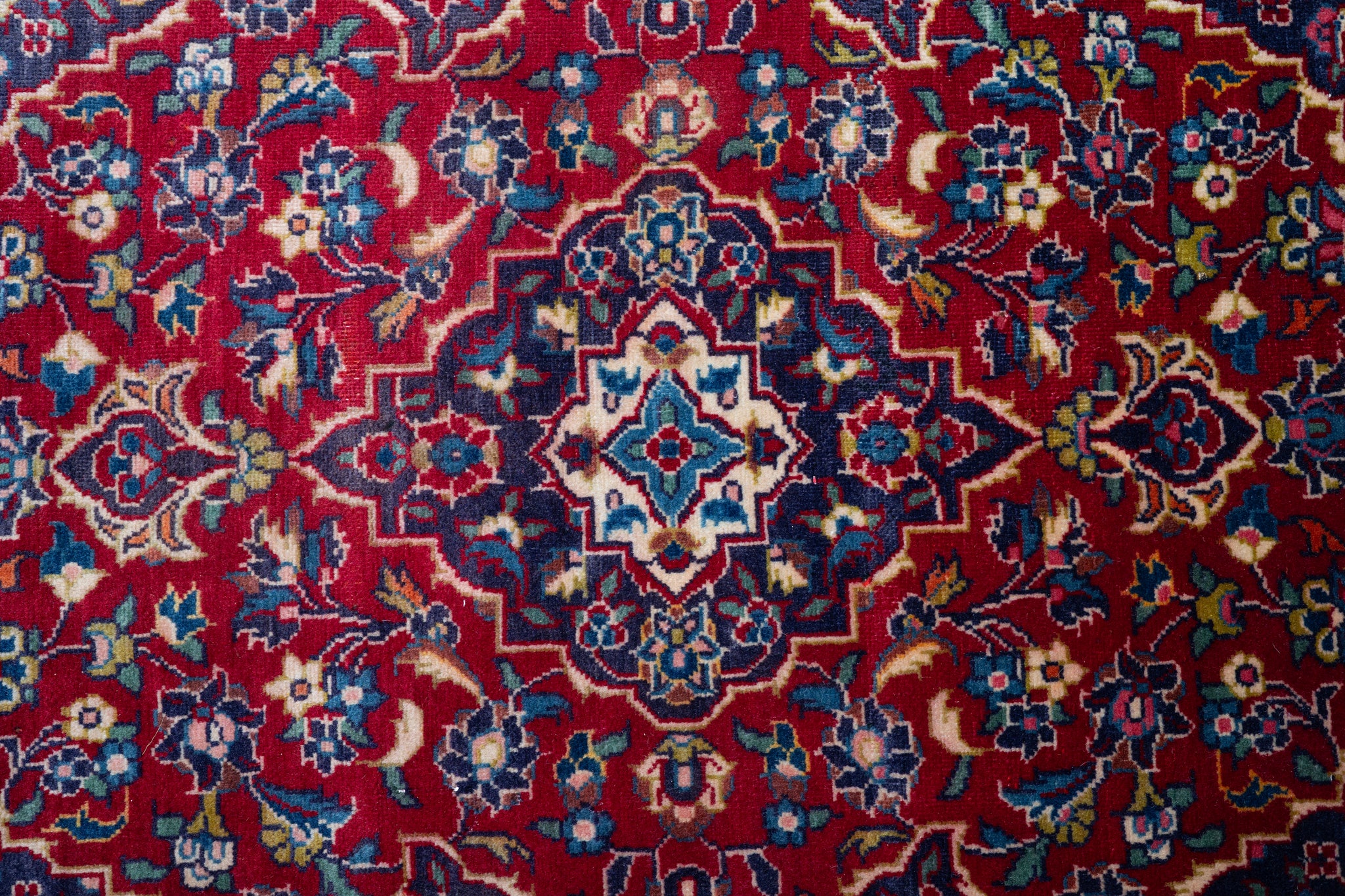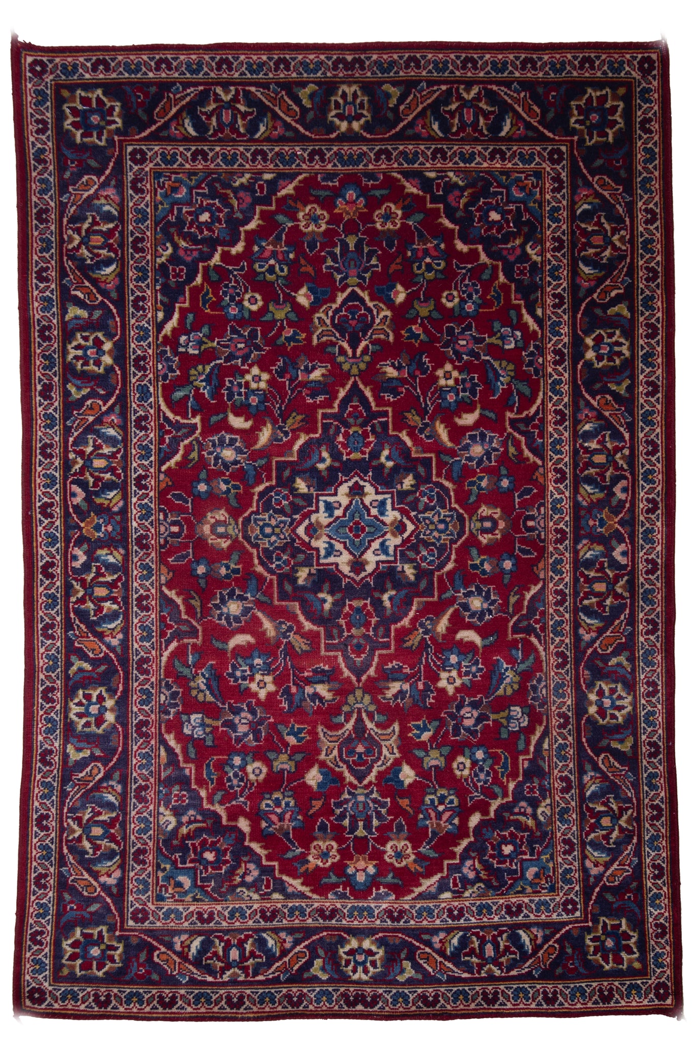This handcrafted Persian Kashan rug is a timeless example of classical elegance and masterful craftsmanship. Woven from fine wool, it features a rich crimson field adorned with a symphony of floral motifs and palmettes, anchored by a refined medallion in ivory and sapphire tones. Delicate vines and ornate blossoms radiate outward, framed by an intricate navy border that enhances the rug’s regal charm. The balanced composition and vibrant palette evoke the artistic grandeur of Kashan’s historic weaving tradition. Ideal for luxurious interiors, this rug offers both visual richness and heirloom quality—perfect for collectors and connoisseurs of Persian heritage.