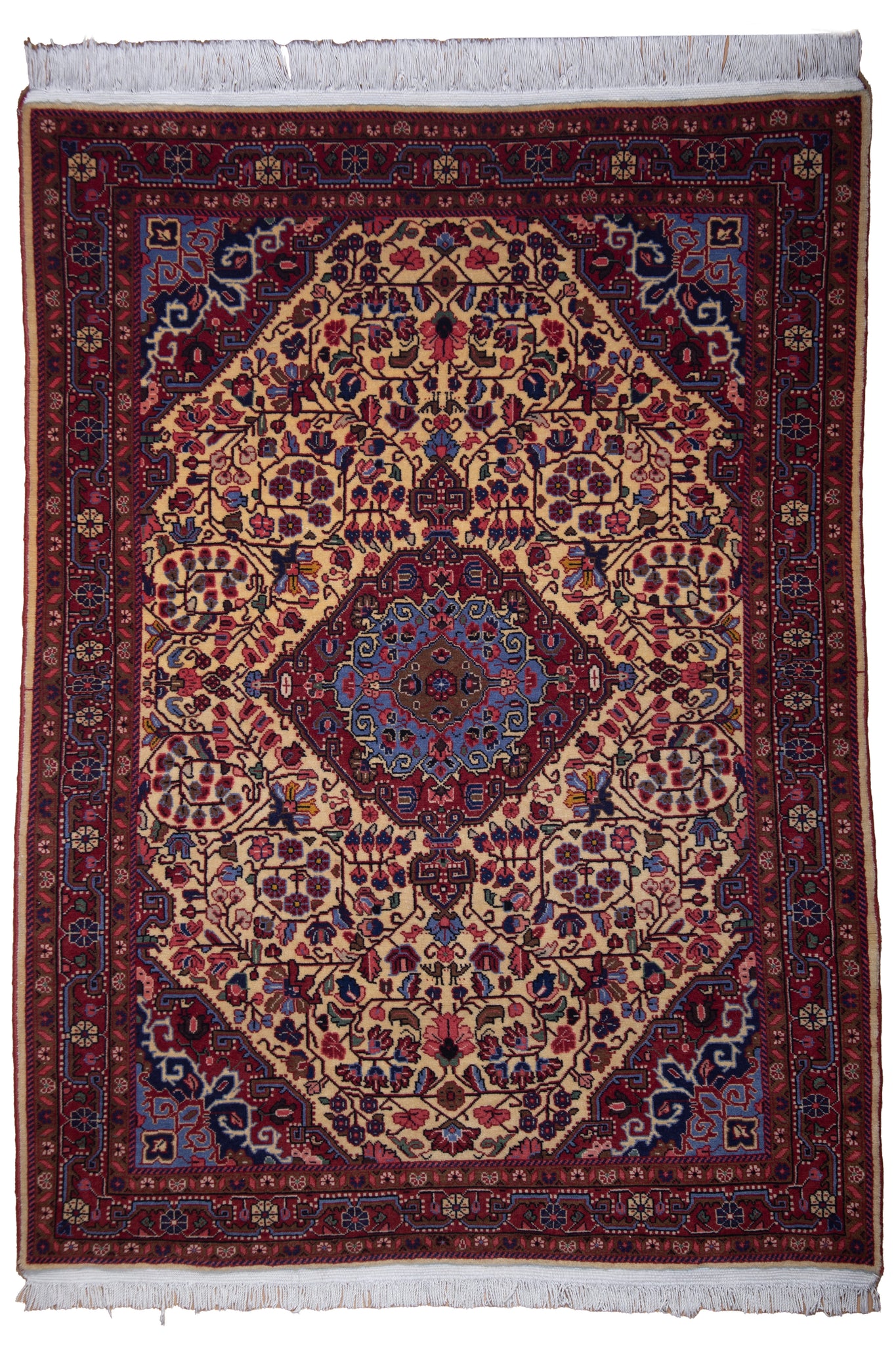 This hand-knotted Persian wool rug hails from the historic weaving region of Malayer, renowned for its refined artistry and richly detailed compositions. The creamy ivory field is gracefully adorned with a floral lattice surrounding a striking diamond medallion in shades of deep crimson, sapphire blue, and rose. Angular corner spandrels and a richly patterned border add depth and classical symmetry. Crafted with high-quality wool, this rug offers a soft, durable pile and timeless elegance. A beautiful example of Malayer craftsmanship, it blends rustic charm with intricate detailing—ideal for collectors and those seeking authentic Persian character in their interiors.