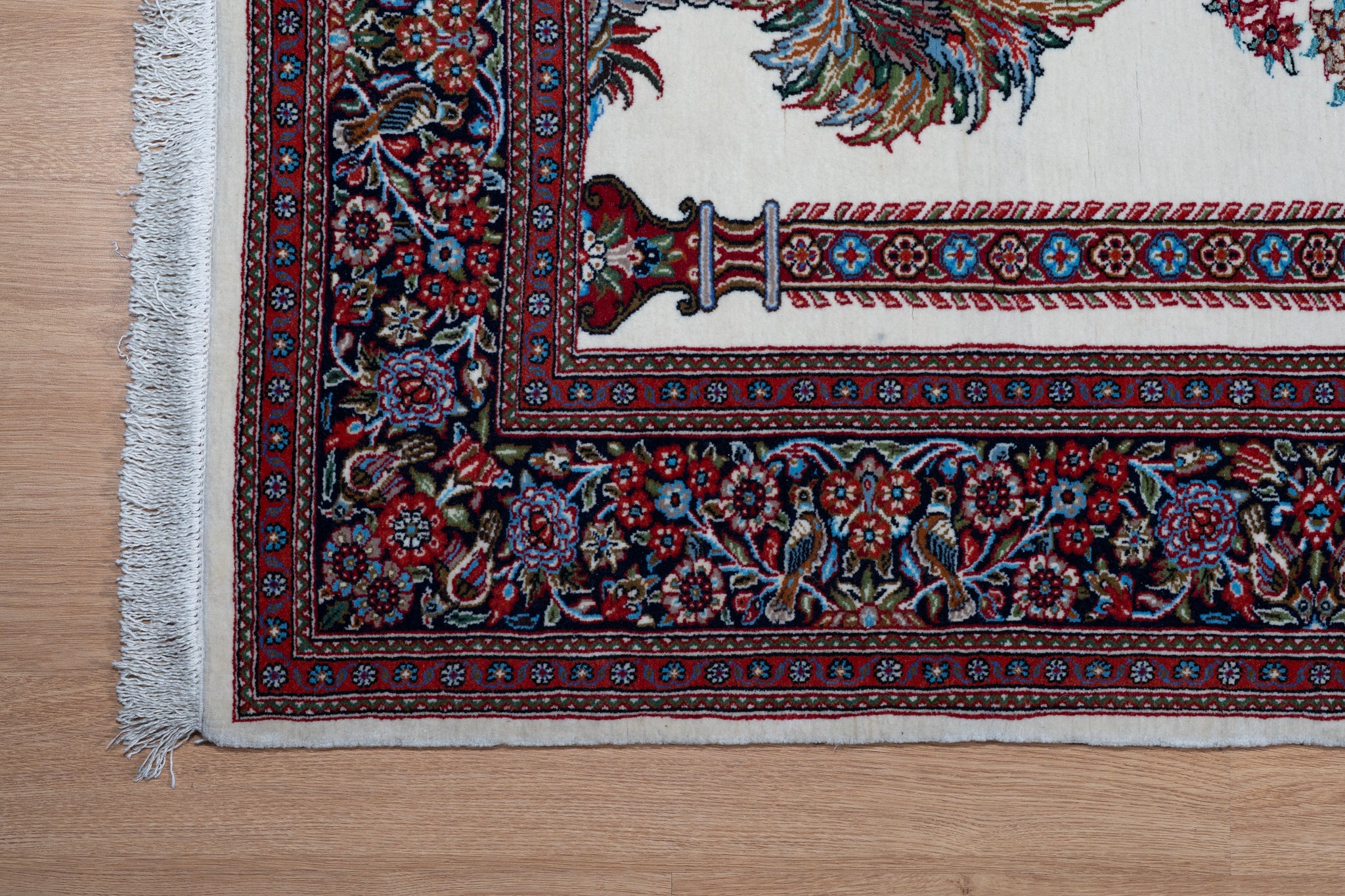 This exquisite Iranian “Tree of Life” rug is a poetic testament to Persian artistry and symbolism. Hand-knotted with fine wool and silk, it features a serene ivory field where the legendary tree flourishes—laden with blossoms and encircled by soaring birds, symbolizing paradise, renewal, and spiritual harmony. The architectural arch above and ornate vase motif frame the scene like a portal to a sacred garden. Deep crimson and sapphire borders enriched with floral arabesques enhance its regal presence. A true collector’s treasure, this piece reflects centuries of craftsmanship and philosophical depth, ideal for refined interiors that celebrate elegance, meaning, and cultural legacy.