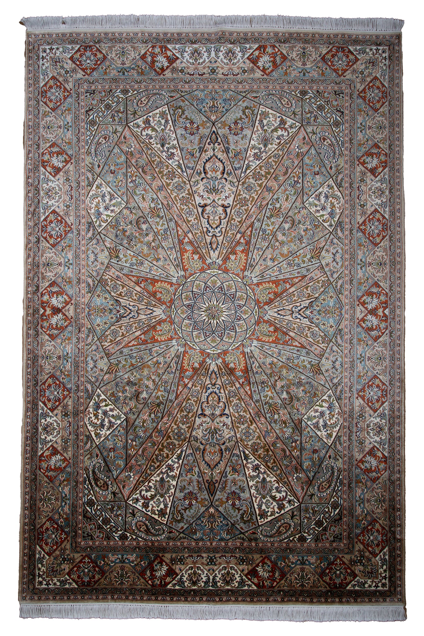 A marvel of Kashmiri artistry, this pure silk rug captures the grandeur of Persian-inspired geometry with divine precision. Its radiant medallion—evoking a celestial dome—blooms outward in an exquisite symphony of blues, burnished reds, and soft golds. Each petal-like segment is intricately hand-knotted using premium mulberry silk, ensuring a luminous sheen and ultra-fine detailing. The border, adorned with diamond cartouches and floral motifs, frames the piece with majestic elegance. Designed for discerning collectors, this rug celebrates centuries-old craftsmanship while offering a timeless statement for refined interiors. An heirloom-quality creation that fuses sacred geometry with textile mastery. A true connoisseur’s masterpiece.