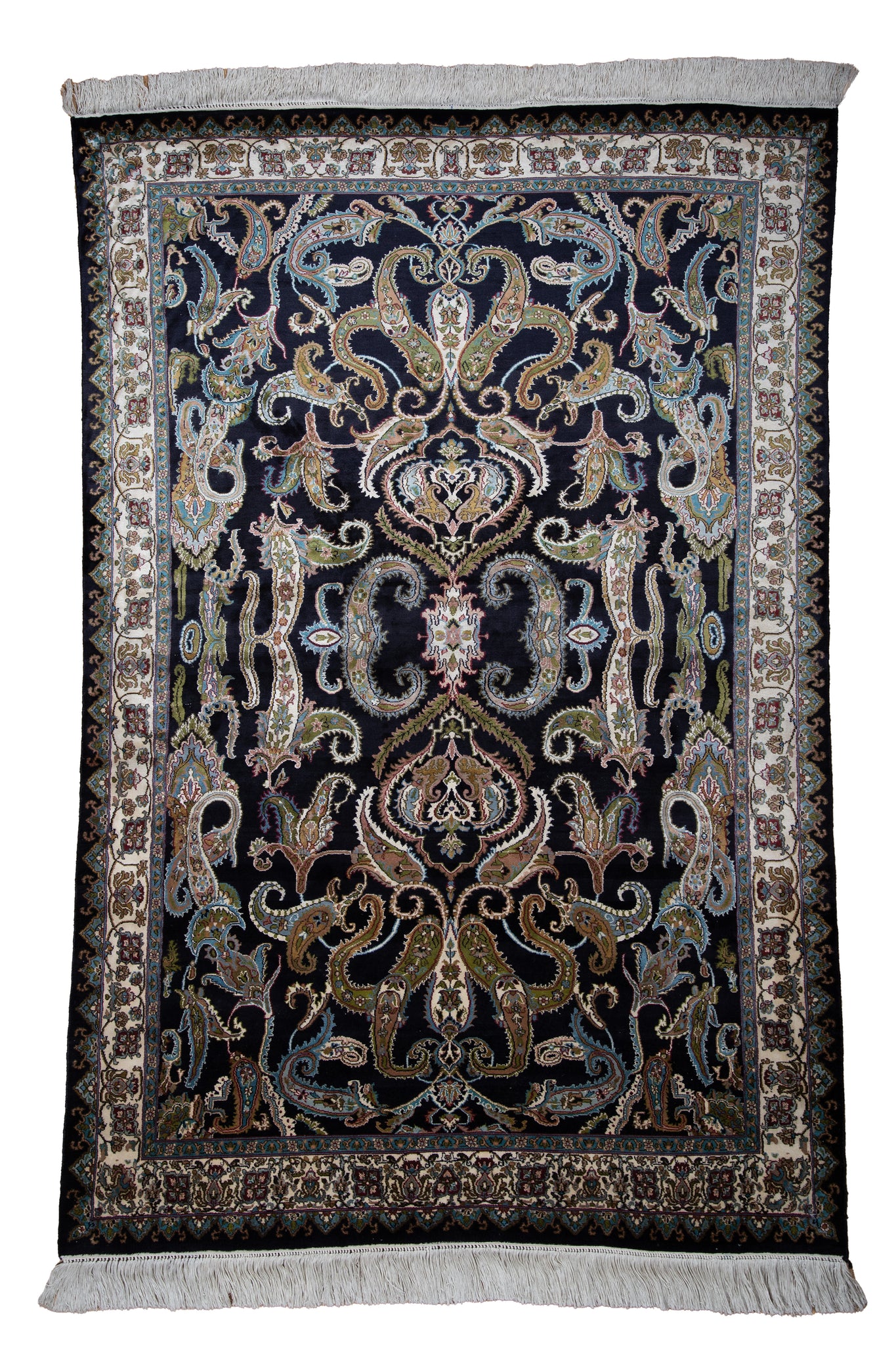 Experience the grandeur of Kashmiri artistry with this exquisite Pashmindar silk-on-silk rug, hand-knotted with an exceptionally high knot count by master weavers. Featuring a stunning deep navy field, the rug is adorned with a mesmerizing arrangement of paisleys, floral vines, and symmetrical arabesques in hues of jade green, ivory, rosewood, soft teal, and burnished gold. The intricacy of the pattern, set against the richness of the silk, brings a luxurious sheen and dimensionality that shifts with light. Framed with a luminous ivory border decorated in classical motifs, this rug is a striking statement piece for both traditional and contemporary spaces. The design is inspired by the grandeur of Persian gardens, interpreted through the lens of Kashmir's celebrated Pashmindar weaving tradition. A true collector’s item and an heirloom in the making, this rug is ideal for connoisseurs seeking refinement, craftsmanship, and timeless elegance in their interiors.