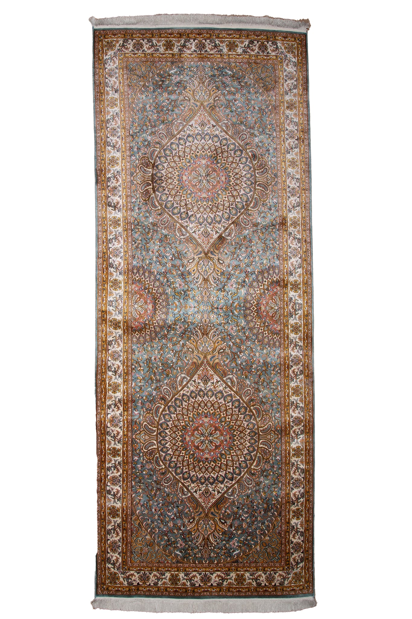 A true celebration of Kashmiri mastery, this silk-on-silk runner rug is hand-knotted with a remarkable high knot count, allowing for exceptional clarity and elegance. Its luminous blue field is adorned with dual grand medallions—each framed in delicate latticework and floral vines, inspired by Mughal architecture and garden motifs. Accents of coral, ivory, and antique gold lend the piece a timeless sophistication, while the mulberry silk base shimmers with every step. Ideal for hallways or gallery spaces, this rug is both art and heritage—crafted to be admired, cherished, and passed down. A rare collector’s gem for refined interiors.