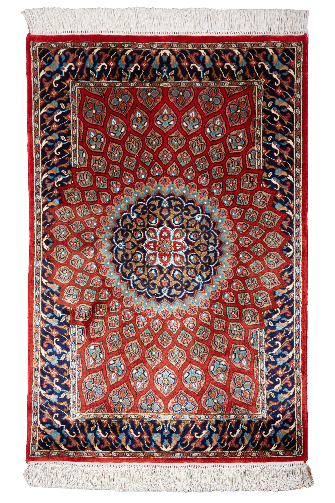 This striking Kashmiri silk-on-silk rug is a radiant homage to classical Persian medallion design, interpreted through the unparalleled finesse of Kashmiri craftsmanship. Hand-knotted with premium mulberry silk, it features a luminous ruby-red field exploding into a hypnotic mandala of floral motifs in lapis, ivory, gold, and espresso tones. The central medallion—bold yet intricately detailed—draws the eye inward like a blooming sunburst, framed by a scrolling midnight-blue border that enhances its grandeur. With its high knot density, regal sheen, and vivid palette, this heirloom-worthy piece is designed for collectors seeking luxury, heritage, and extraordinary visual impact in one timeless creation.