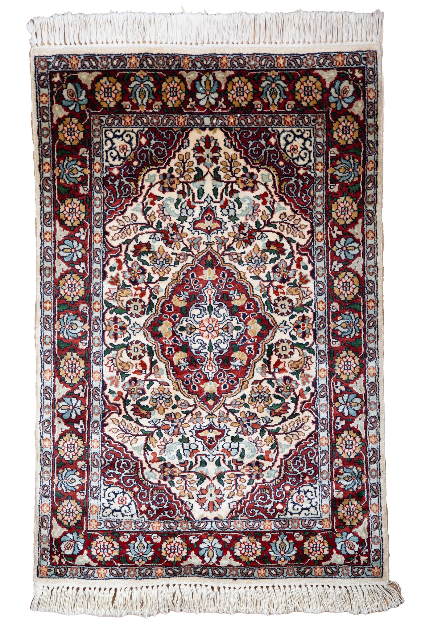 This radiant silk Kashmiri rug is a timeless testament to Persian-inspired artistry and meticulous hand-knotting. Set against an elegant ivory backdrop, the crimson central medallion blooms with layers of sapphire, celadon, and rose—each petal and vine woven in gleaming pure silk. Framed by a lush border of stylized floral motifs on a ruby red base, the composition exudes warmth, balance, and regal charm. The silk’s natural luster enhances every detail, creating a mesmerizing interplay of colour and light. Ideal for collectors or statement interiors, this rug is both art and heirloom—where tradition, craftsmanship, and luxury seamlessly converge.