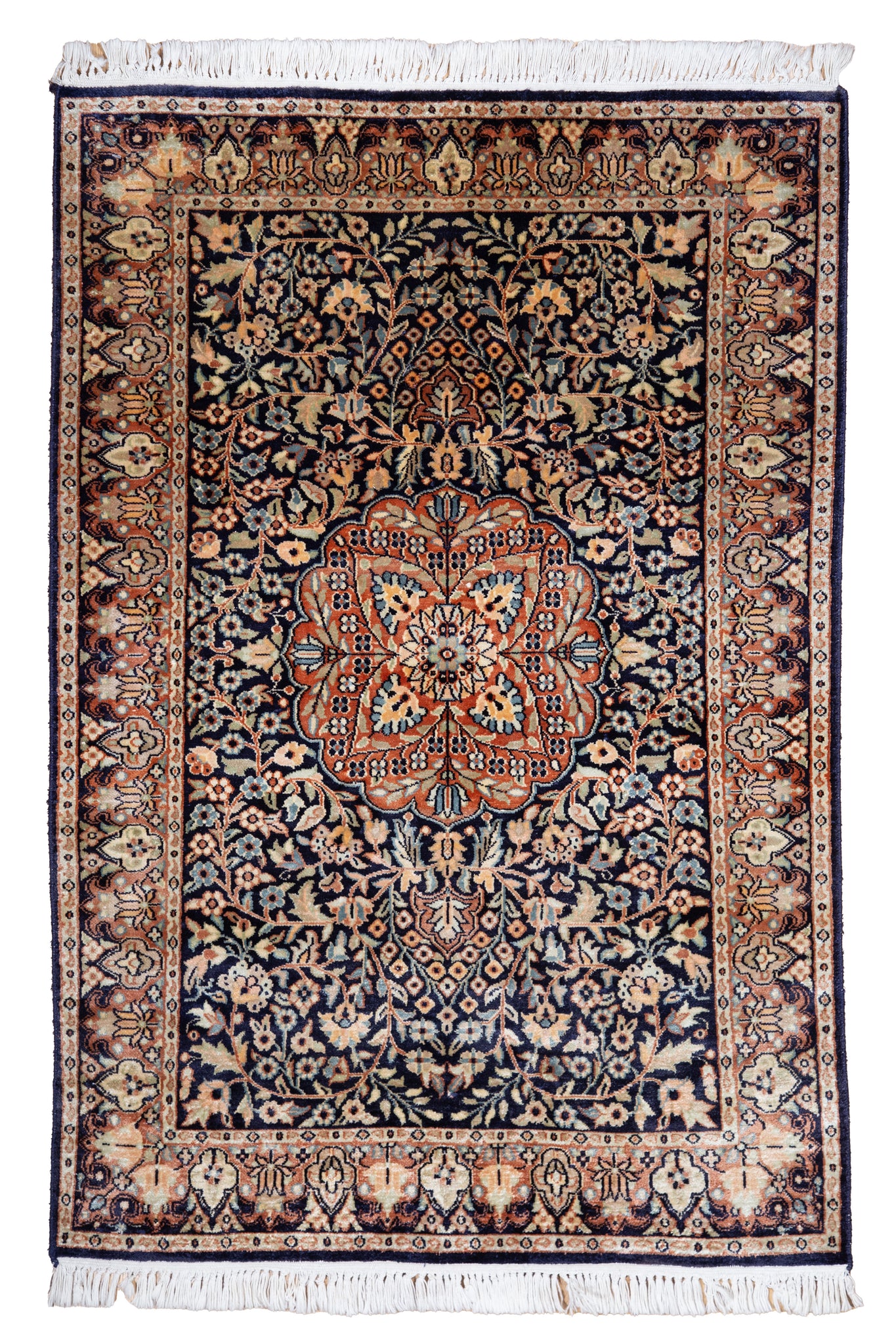 This exquisite pure silk rug from Kashmir is a stunning example of traditional craftsmanship, hand-knotted with a high knot count that ensures exceptional detail and durability. The deep midnight blue base sets a dramatic tone, showcasing a richly layered floral medallion at the center in radiant shades of burnt orange, ivory, gold, and light blue. The rug's intricate all-over floral motif radiates outward with vines, blossoms, and paisley-like forms, creating a mesmerizing garden-like composition. The ornate border, with repeating floral and geometric patterns, enhances the balance and richness of the design. Woven entirely from fine silk, the rug exudes a luxurious sheen and softness underfoot, making it both a visual and tactile delight. Perfect for formal living spaces, private studies, or curated interiors, this rug is not just a piece of decor but a legacy of Kashmiri artistry—where every knot is a celebration of culture, elegance, and timeless beauty.